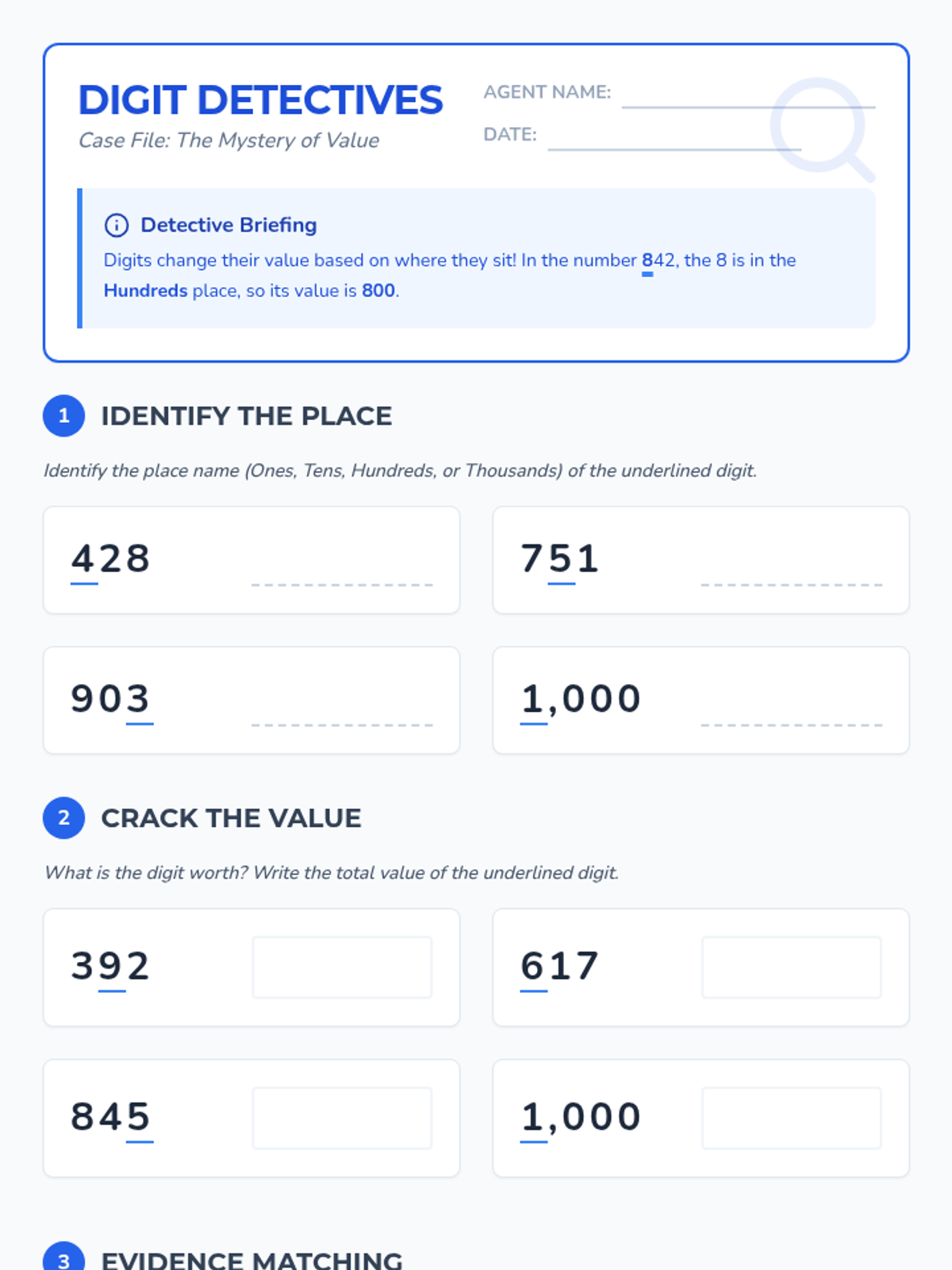 A 3rd-grade math worksheet featuring a detective theme where students identify the place and value of digits up to the thousands place through various exercises including identification, matching, and riddles. Revised with increased answer space and forced page breaks for better usability.