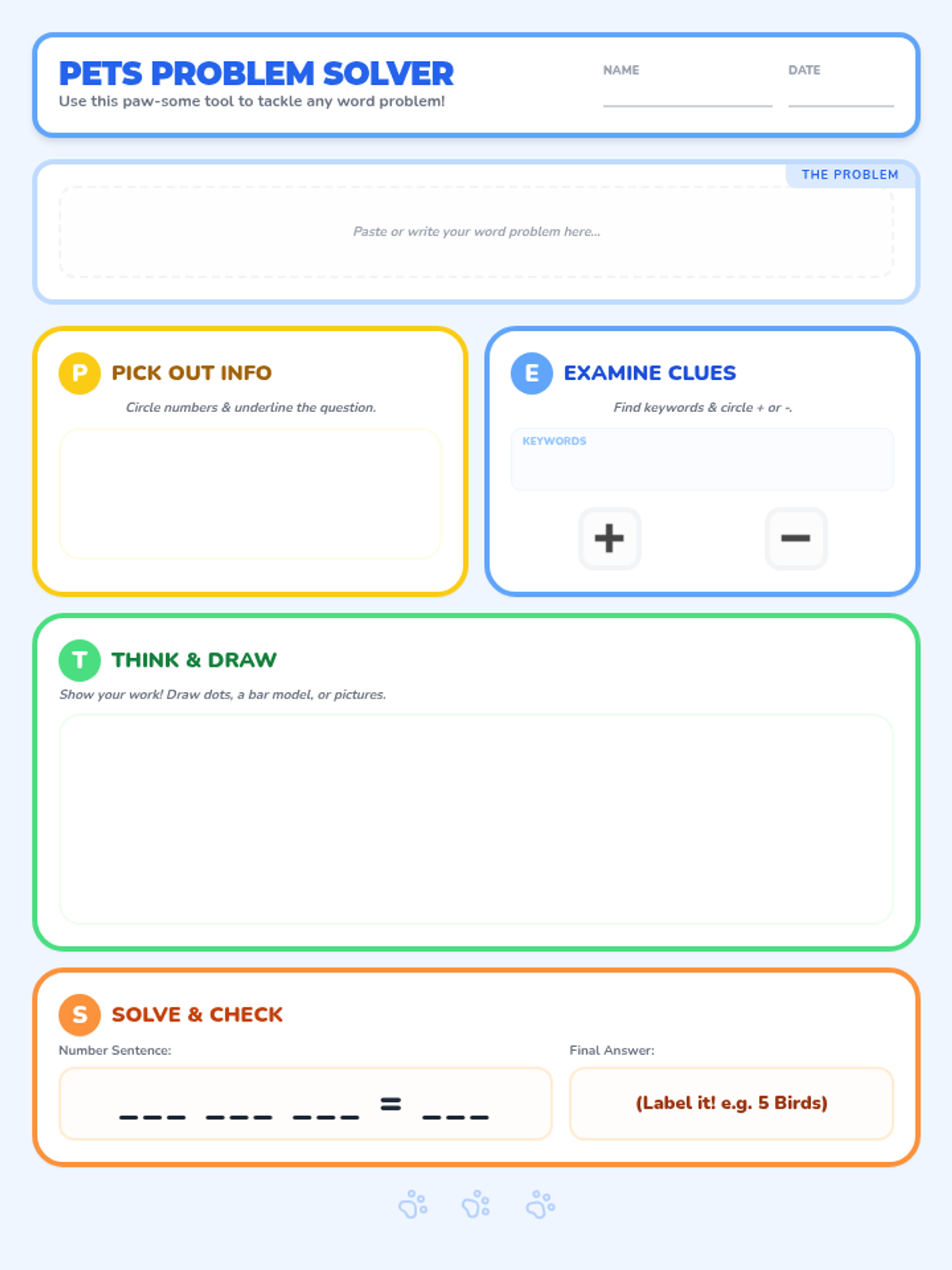 A structured graphic organizer utilizing the 'PETS' (Pick, Examine, Think, Solve) strategy to help students break down and solve word problems.