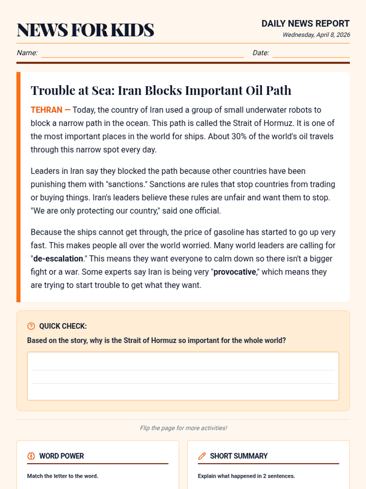 A 5th-grade level social studies worksheet about the fictional 2026 conflict in Iran. Features simplified vocabulary, a shorter news article, and basic fact vs. opinion exercises. Revised for better page flow and larger writing areas.