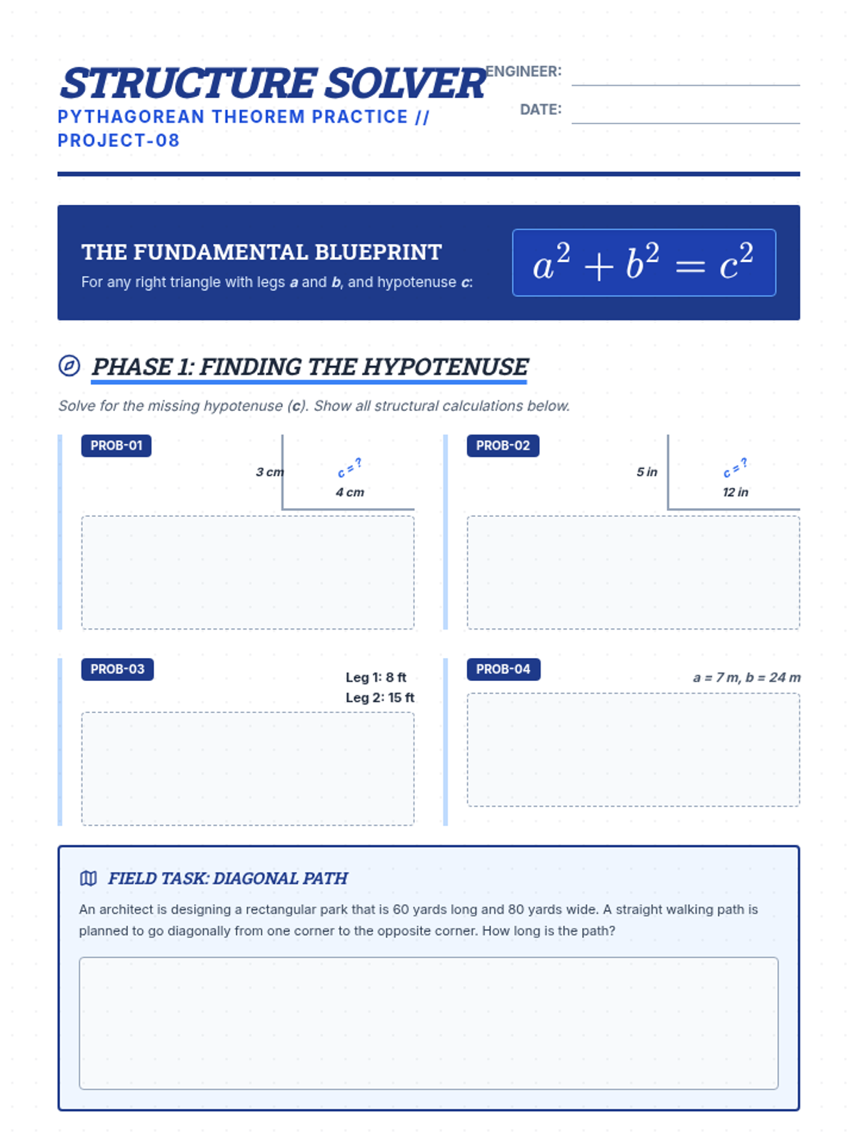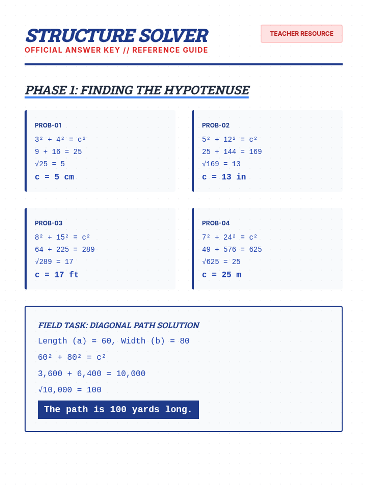 A 14-slide presentation for the 'Triangle Side Truths' lesson, maintaining the blueprint geometry theme. Covers classification of triangles (equilateral, isosceles, scalene) and the Triangle Inequality Theorem with clear visual examples, reliable formula rendering, and a dedicated practice answer key. Revised to fix layout artifacts and label alignment.