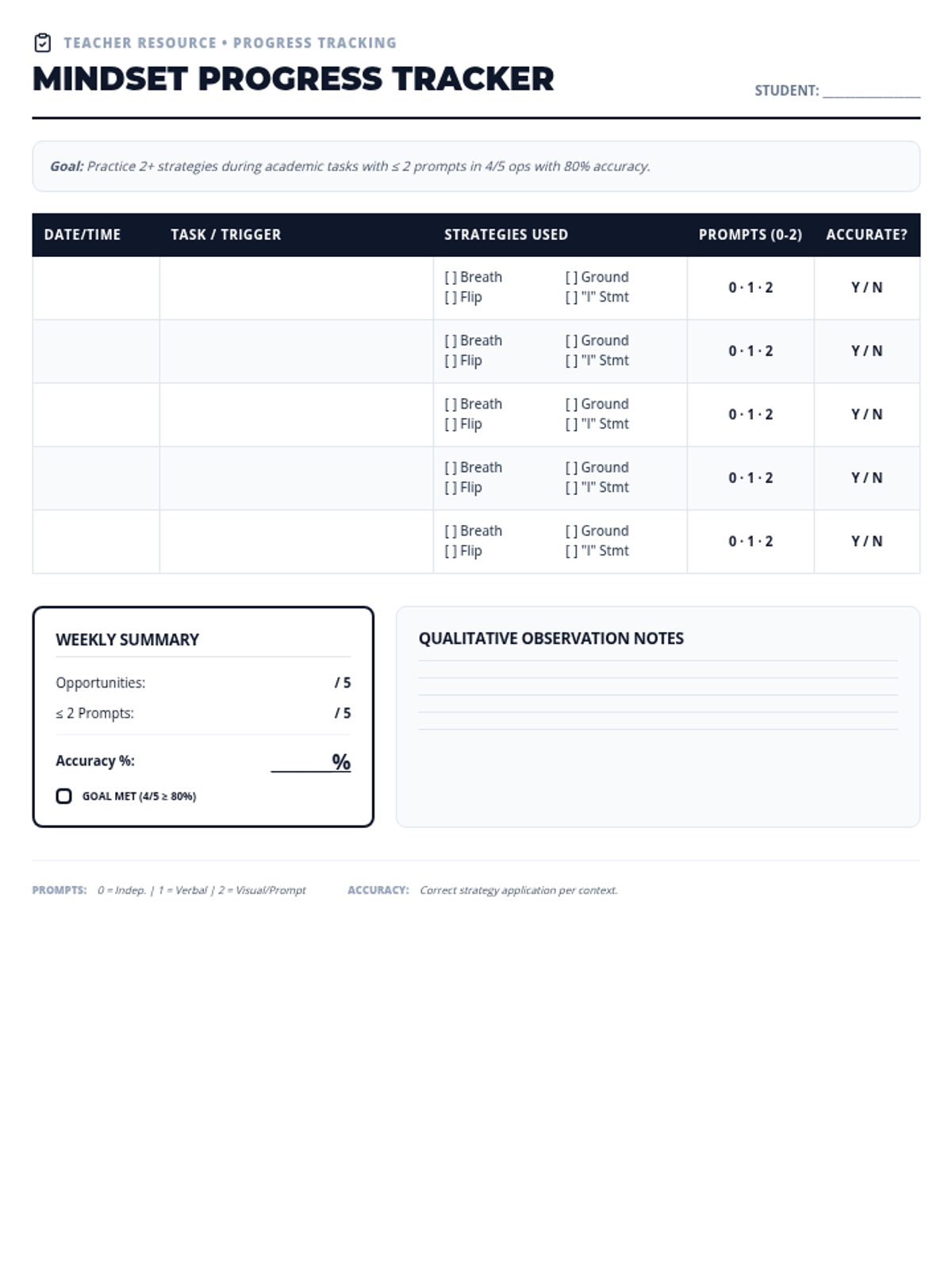 A teacher data collection form to track student progress towards their behavioral goal, measuring opportunities, accuracy, and prompting levels for coping strategy use.