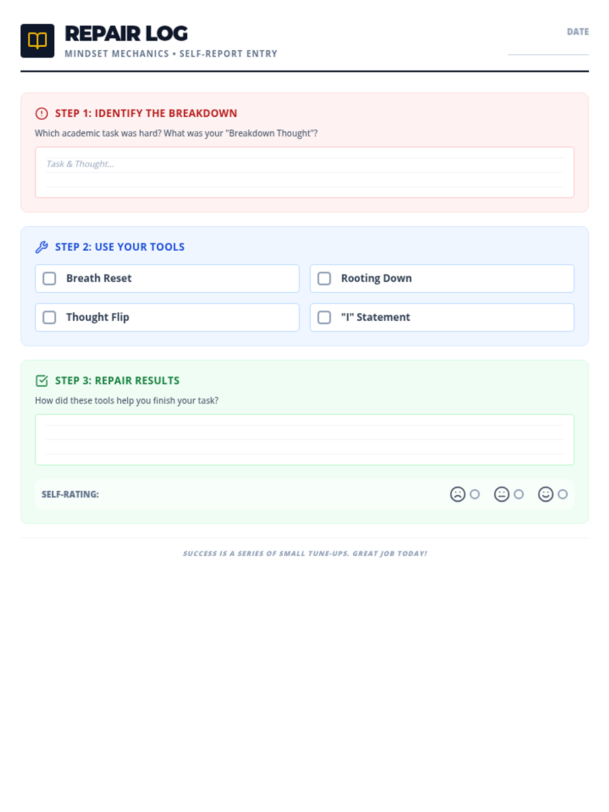 A student self-report journaling page designed as a 'Repair Log' to reflect on their use of coping strategies during challenging academic tasks.