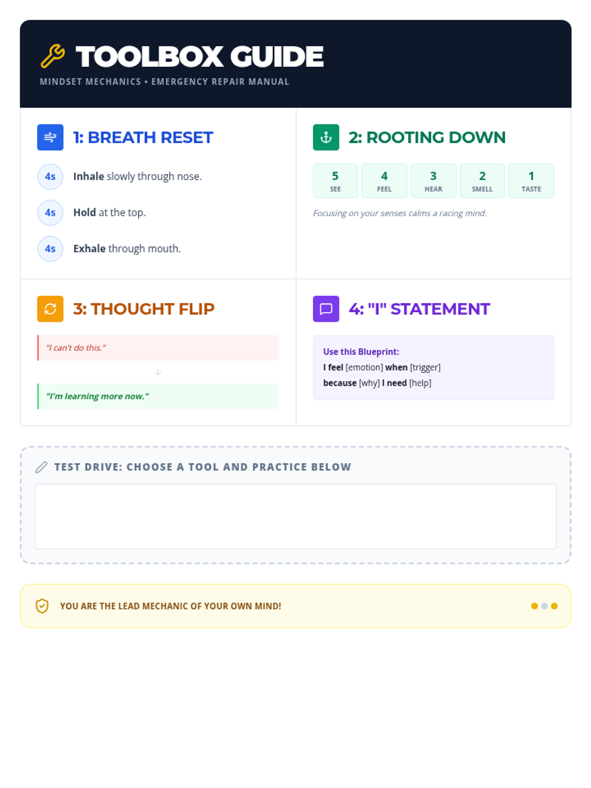 A one-page visual reference guide summarizing the four key coping strategies for student use: deep breathing, grounding, thought reframing, and 'I' statements.