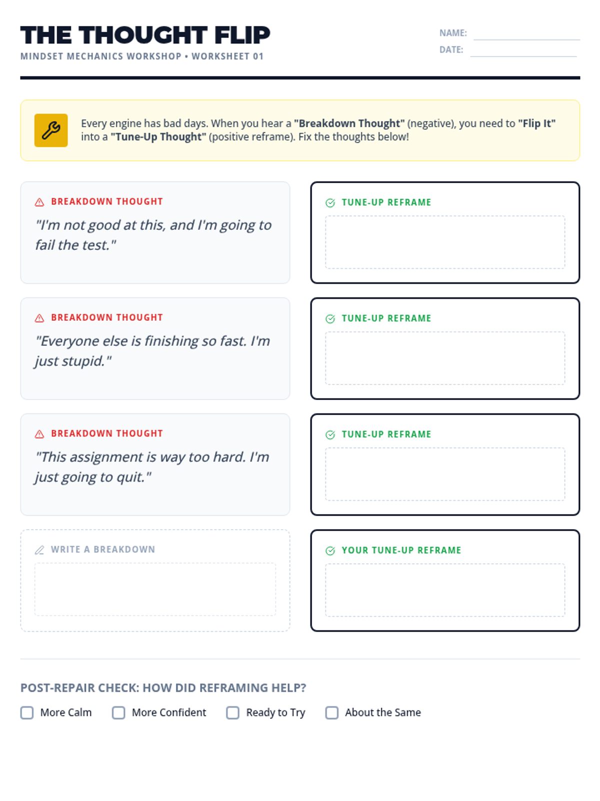 A worksheet for students to practice 'flipping' negative self-talk into positive reframing thoughts to improve their mindset during academic challenges.