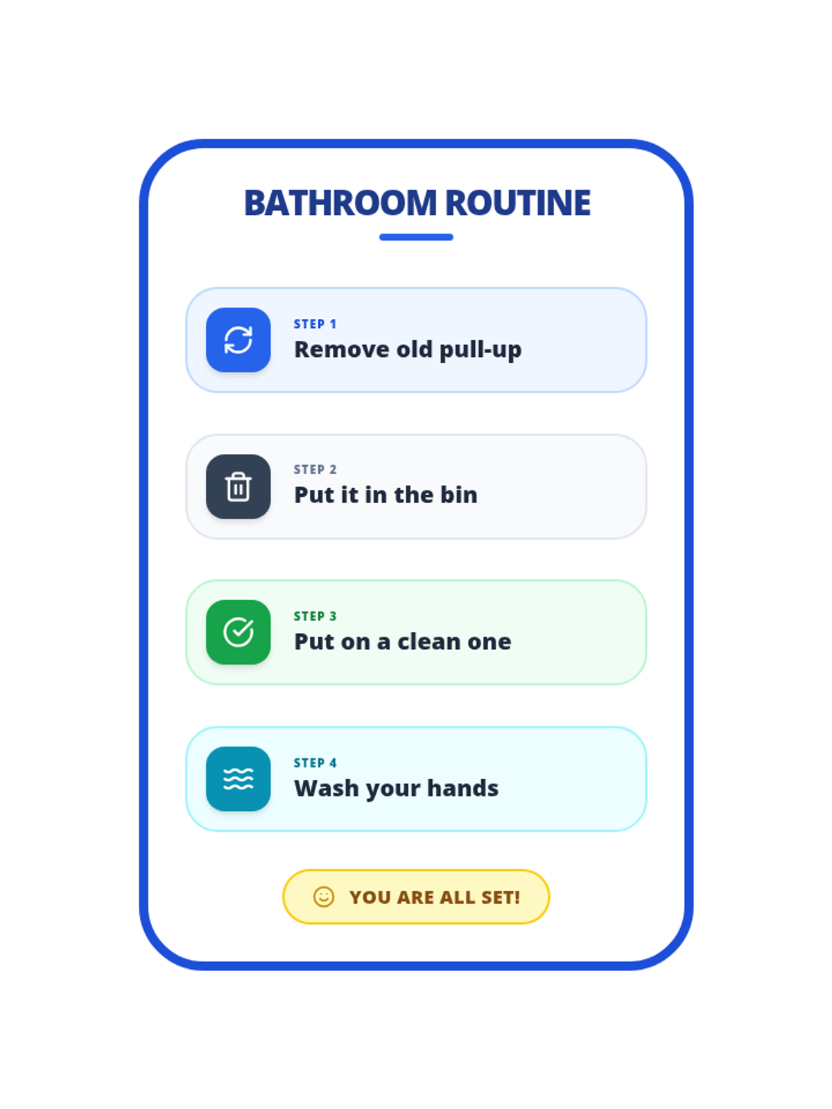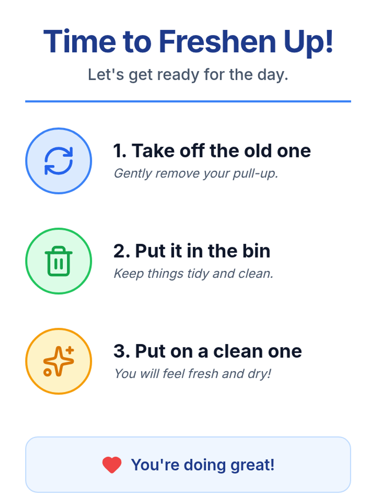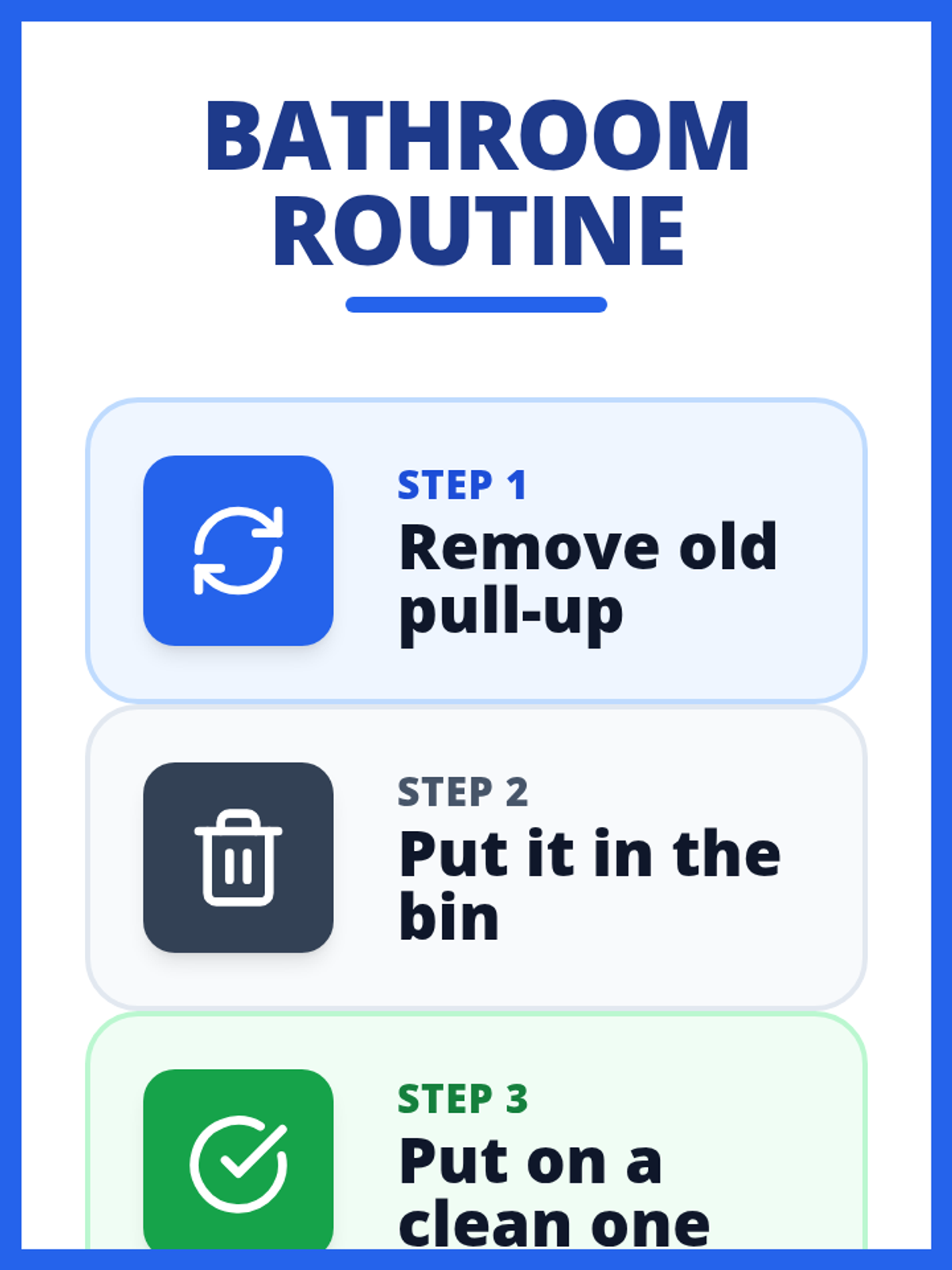A clear, high-contrast visual reminder for seniors with dementia to change their pull-up or brief while in the bathroom. It features large text, simple icons, and a supportive tone.