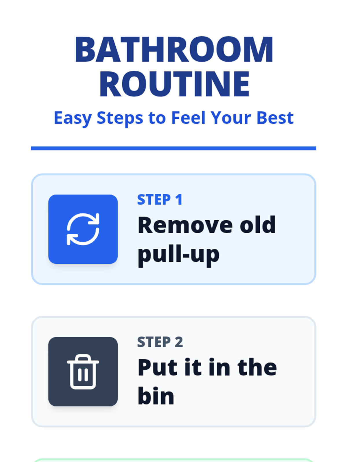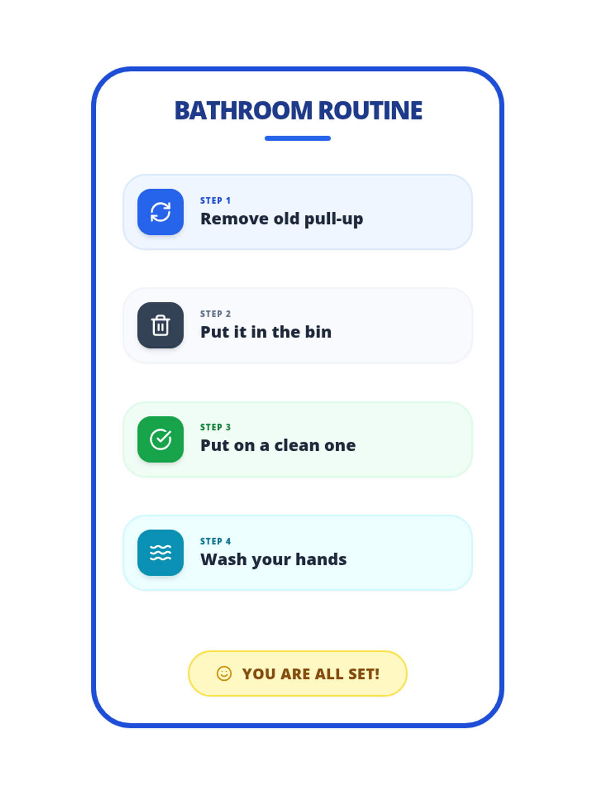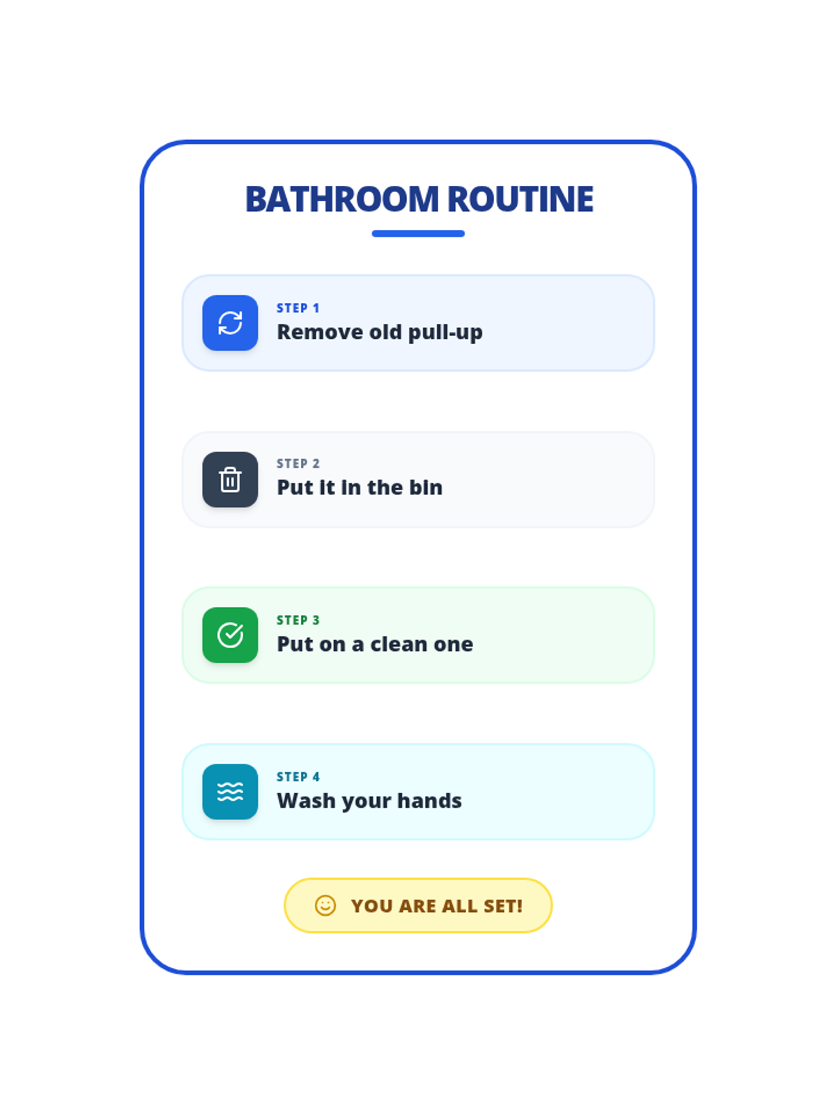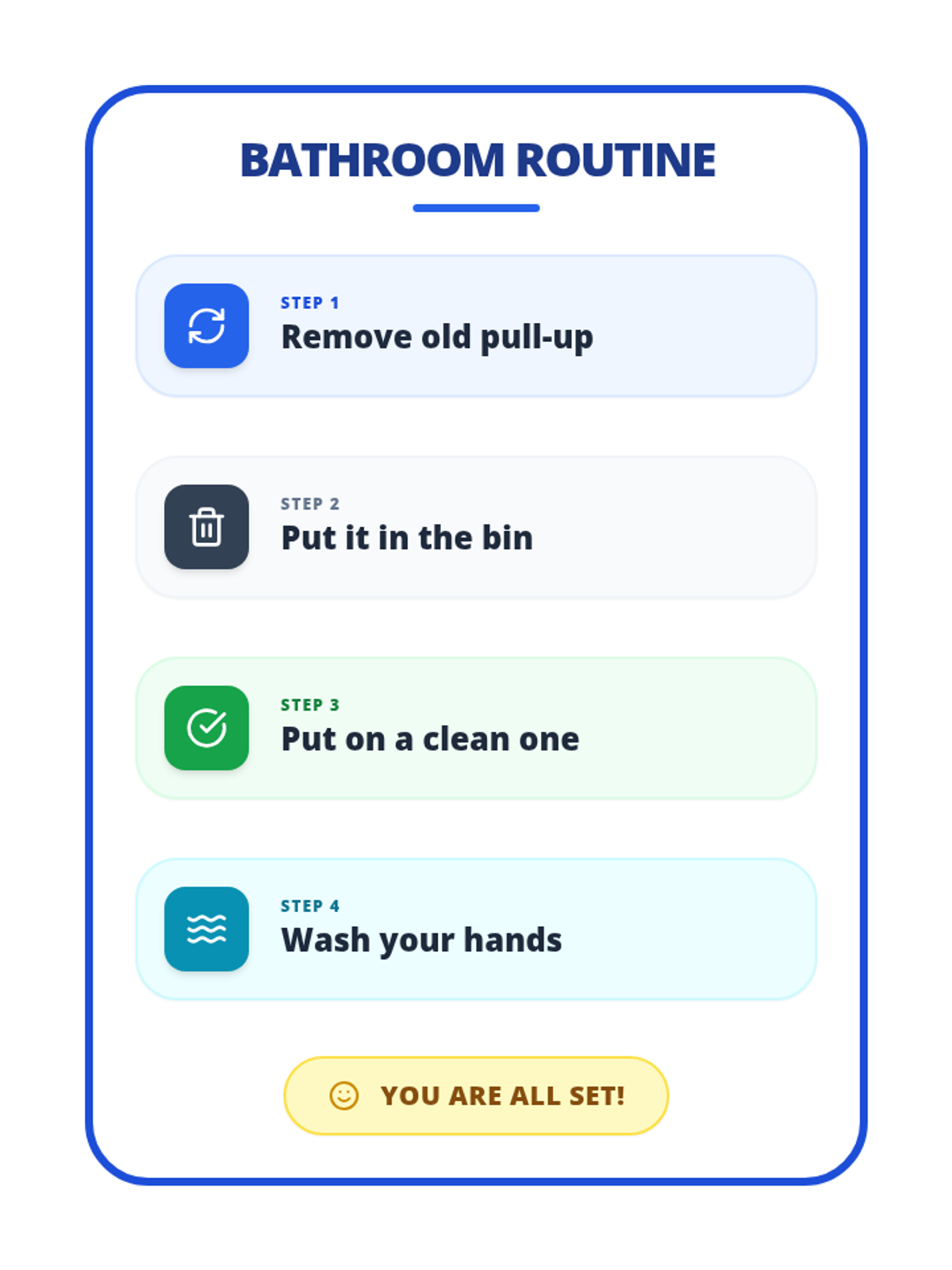 A high-contrast 4-step bathroom routine guide designed for single-page printing. Features large icons and clear headings with conservative 1.5-inch margins to ensure full visibility on all home printers.