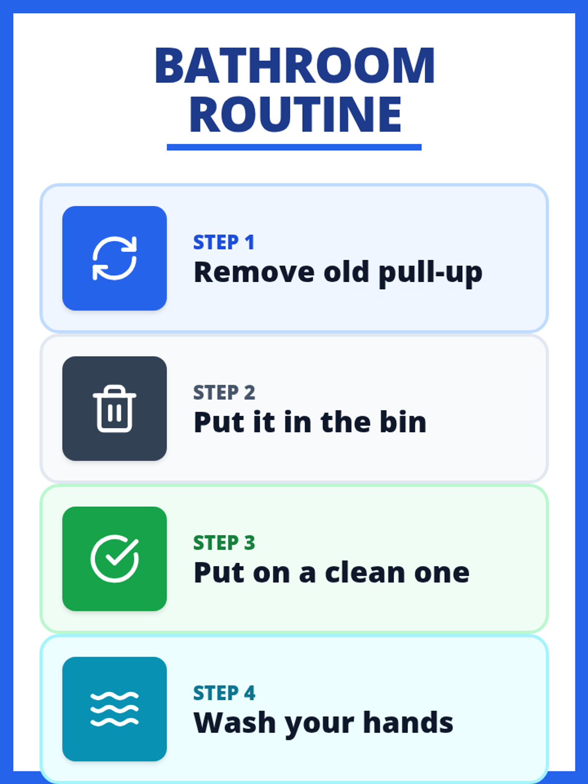 A single-page visual guide designed specifically for letter-sized paper, combining the pull-up change and hand-washing into one simple 4-step sequence for maximum clarity.