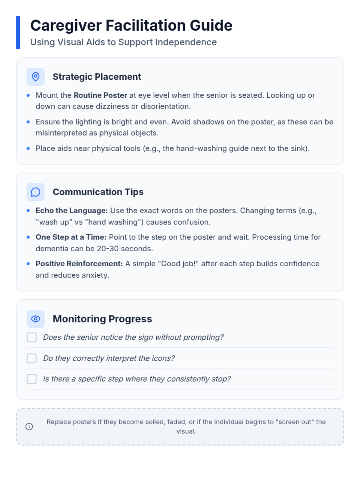 A refined single-page caregiver facilitation guide with tightened spacing and break-inside-avoid classes to ensure objects stay intact and fit on a single letter-sized sheet.