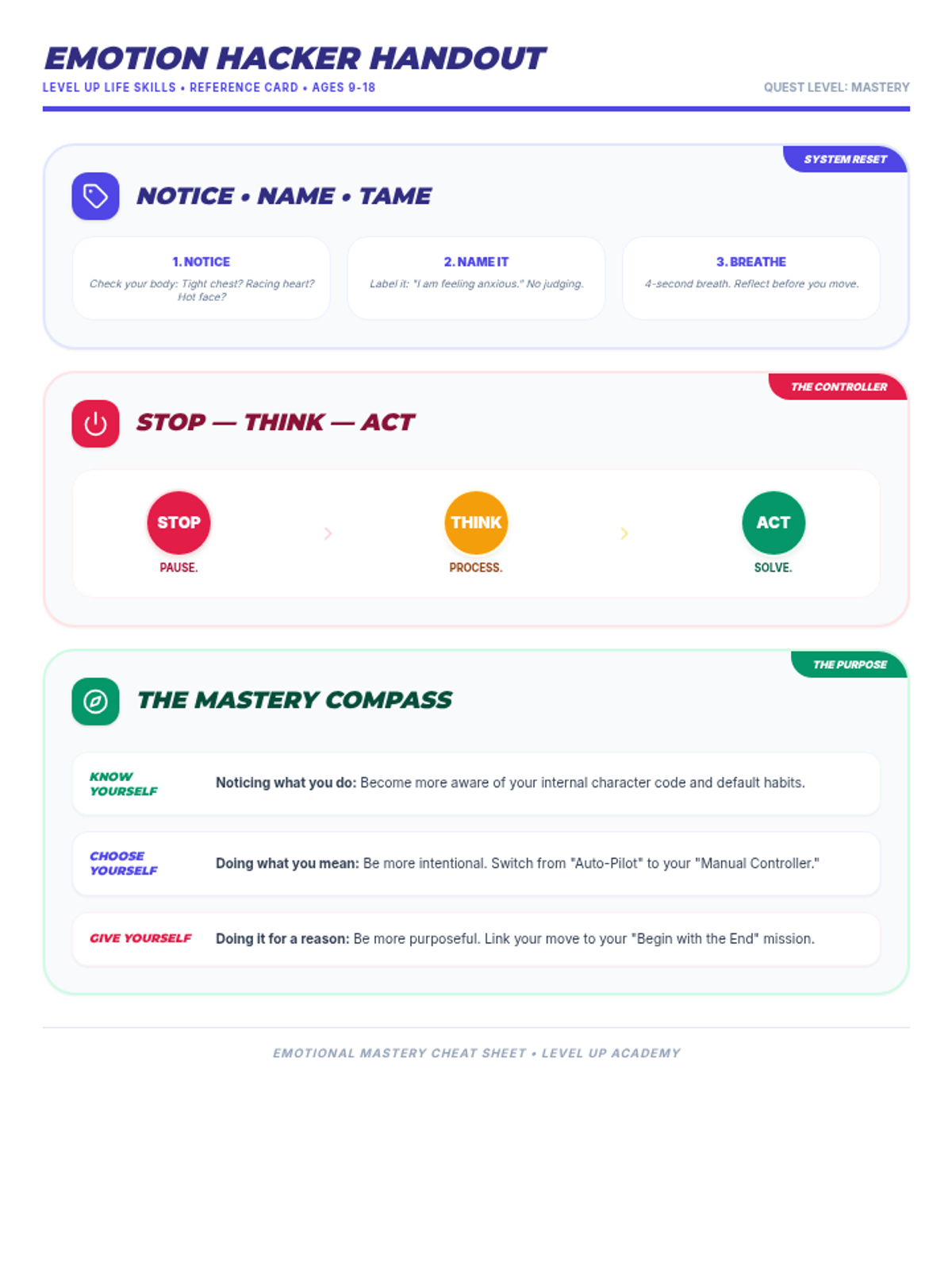A 1-page reference handout for students featuring the "Name It to Tame It" technique, the STOP-THINK-ACT model, and the Know/Choose/Give Mastery Compass for emotional regulation and intentional living.