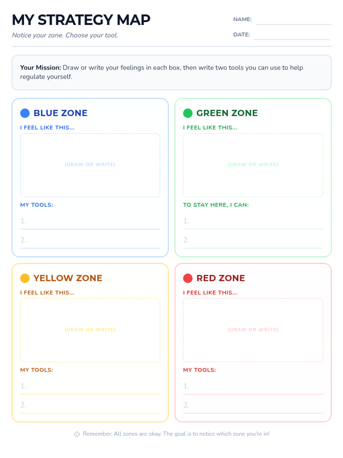 A student worksheet designed for personal reflection, allowing learners to identify their own emotional triggers and select specific calming strategies for each zone.