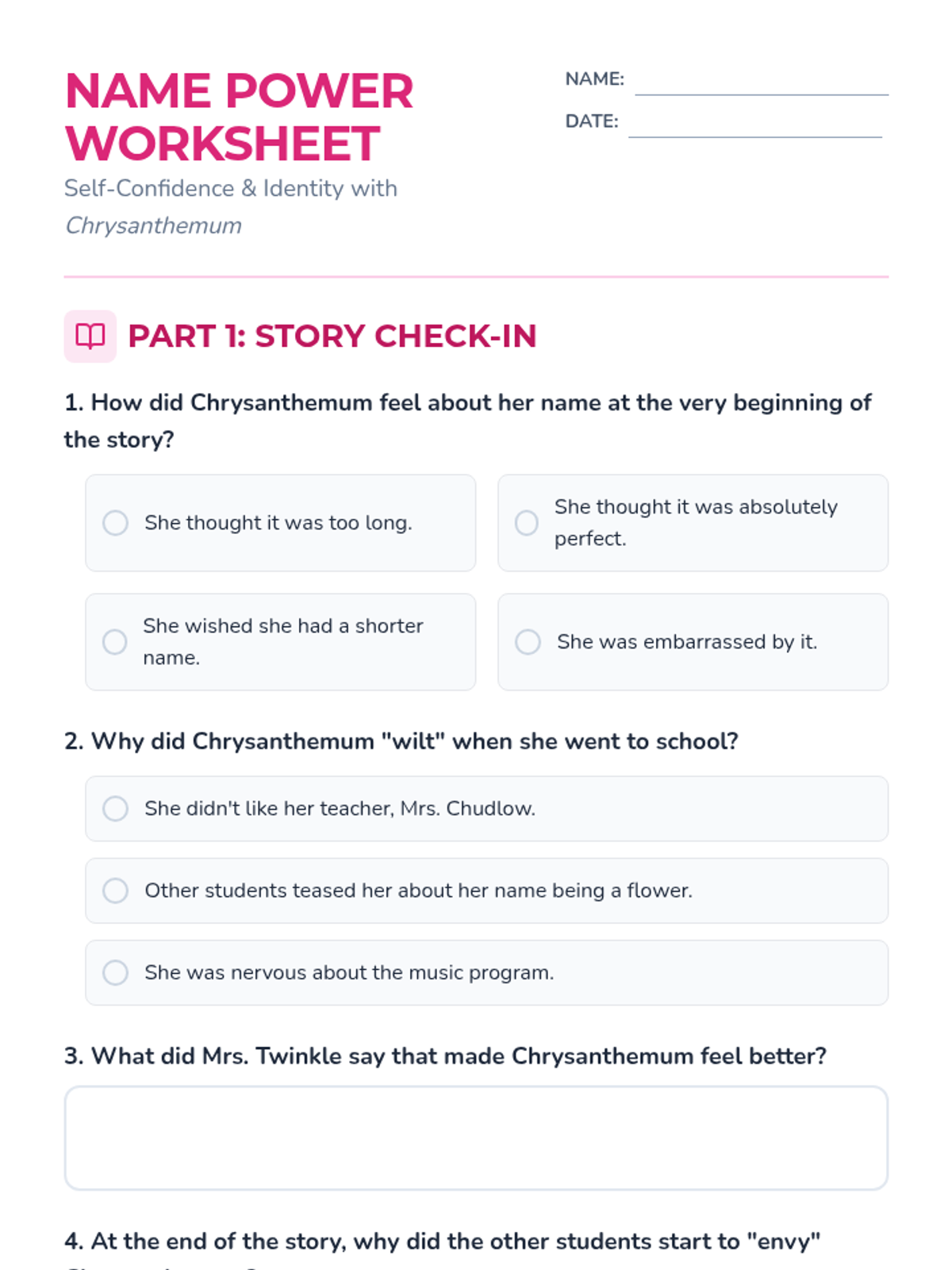 A single-page student worksheet for grades 3-4 featuring comprehension questions (multiple choice and short answer) and a personal reflection section with a drawing area based on the book 'Chrysanthemum'.