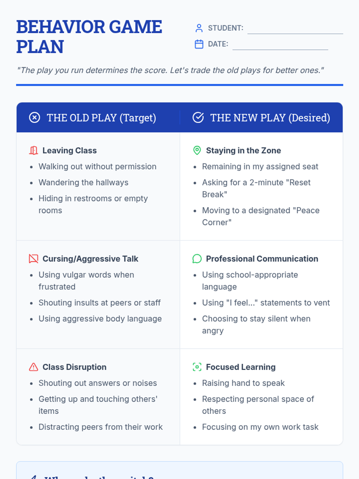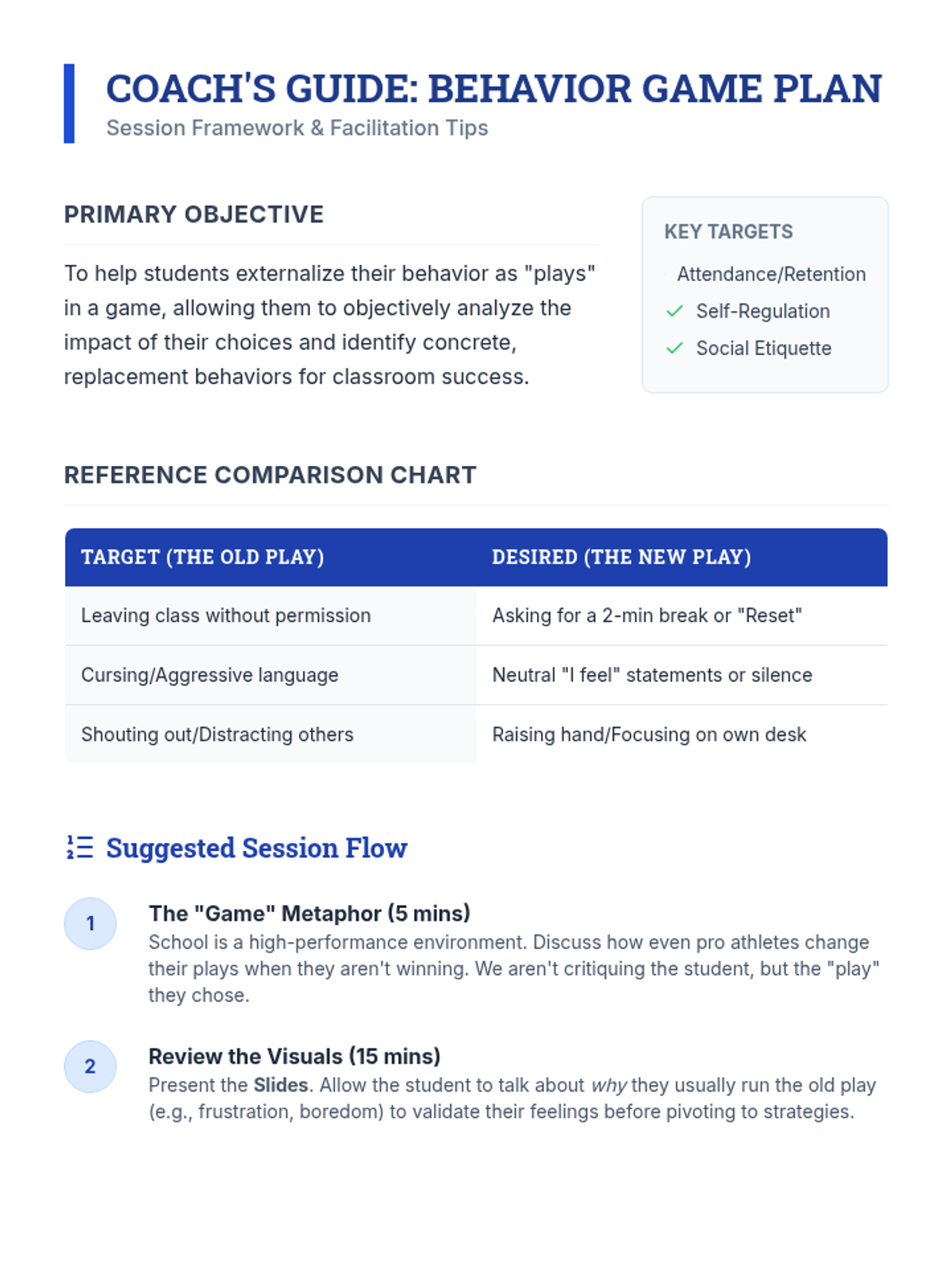 A teacher/counselor guide for facilitating the 'Behavior Game Plan' session, including talking points, role-play prompts, and deep-dive strategies for each behavior.