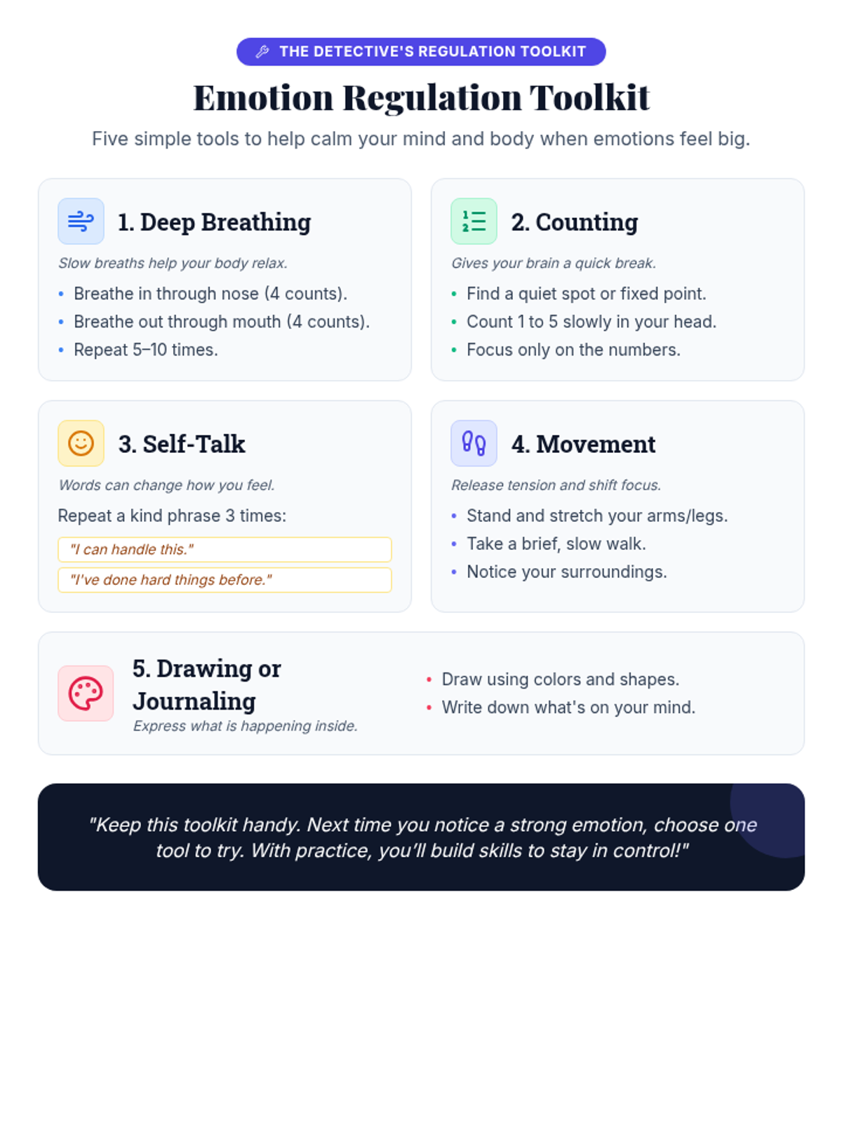 Condensed 1-page reference handout illustrating five emotion regulation strategies for 5th-grade students using a two-column grid layout for efficiency.