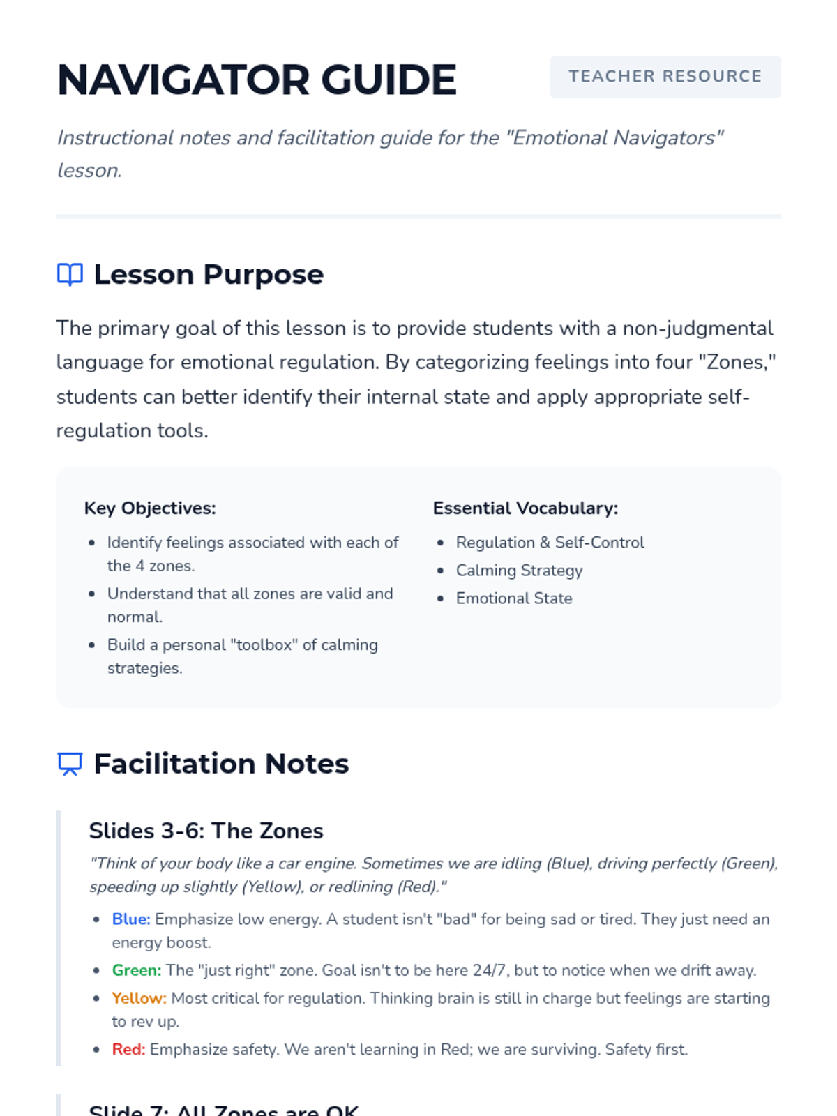 Comprehensive teacher notes and facilitation guide for the Emotional Navigators lesson, including discussion prompts and key instructional insights.