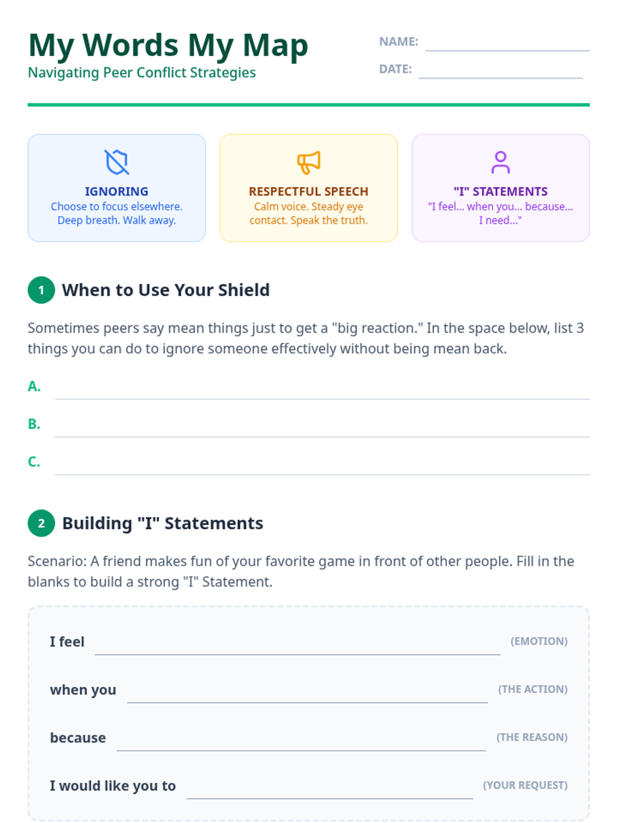 A student worksheet for practicing strategies like 'I' statements and reflecting on the real-world application of conflict resolution skills.