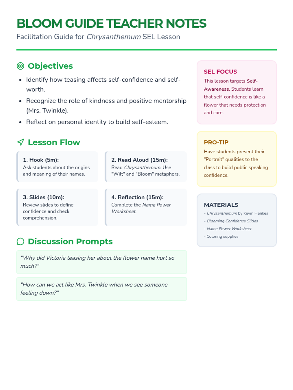 A single-page teacher facilitation guide for the 'Chrysanthemum' SEL lesson, including learning objectives, lesson flow, and discussion prompts.