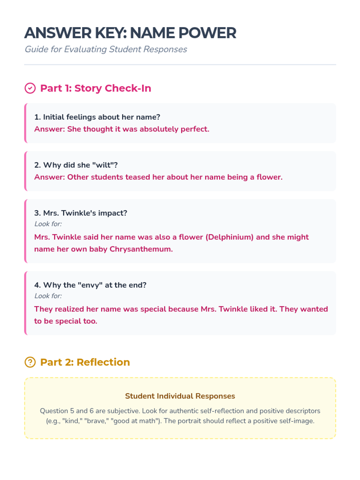 A single-page answer key for the Name Power Worksheet, providing correct answers for comprehension questions and teacher guidance for reflection areas.
