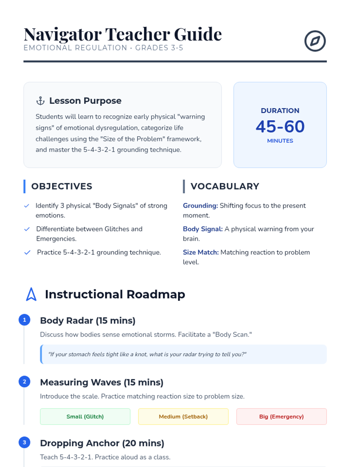 A comprehensive teacher guide for the 'Storm Steady' emotional regulation lesson, featuring instructional steps, discussion prompts, and key vocabulary for teaching grounding and body signal identification.