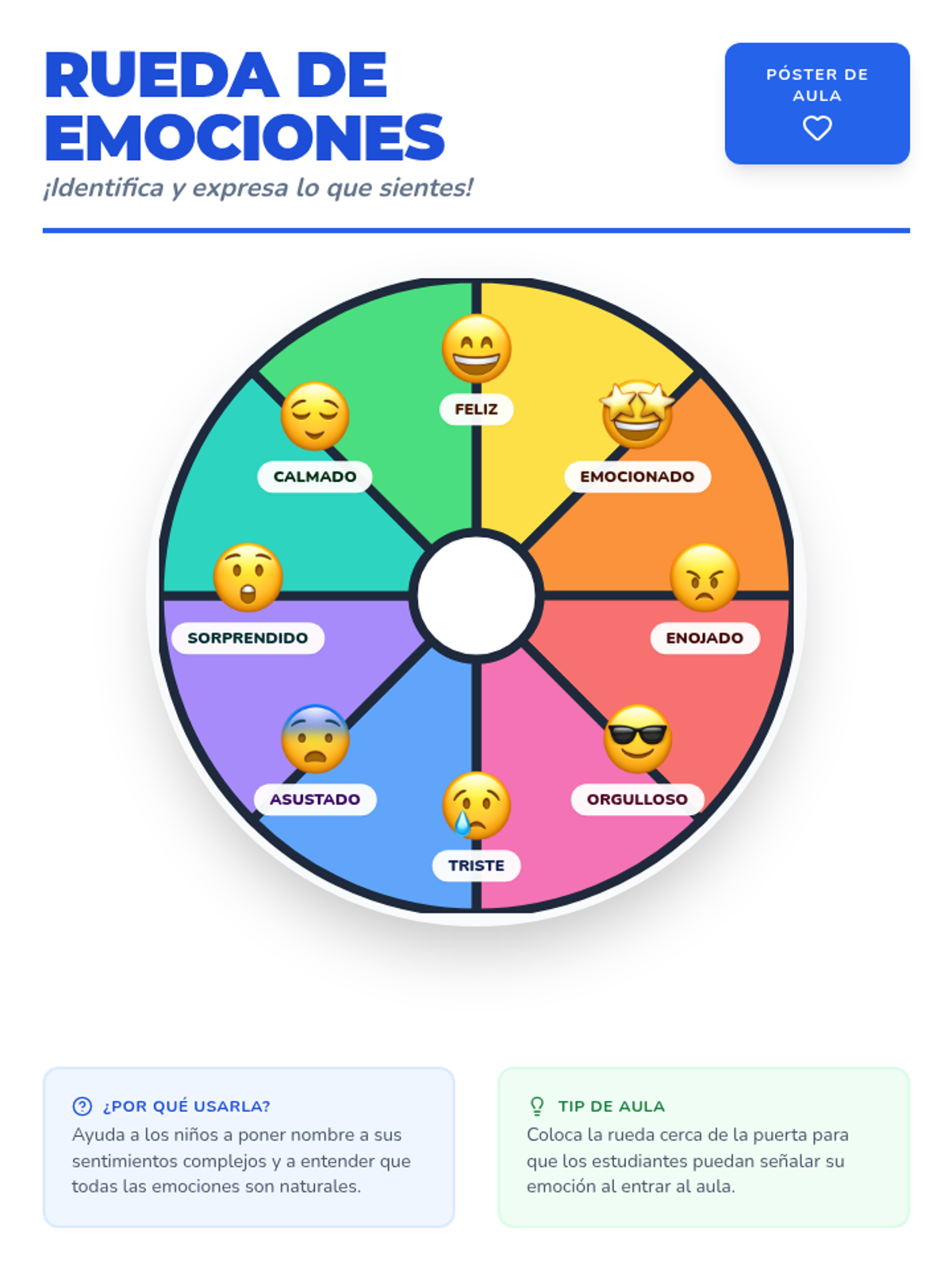 Un conjunto de dos páginas que incluye un póster completo de la rueda de emociones y una versión de ficha de trabajo para que el estudiante la complete. El diseño está optimizado para impresión en blanco y negro o a color.