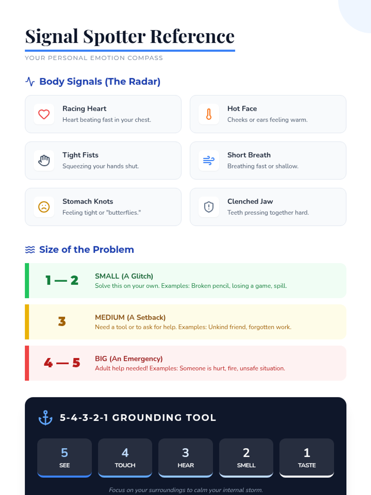 A student-facing anchor chart and reference sheet defining physical body signals, problem sizes (glitch vs. emergency), and the 5-4-3-2-1 grounding technique.