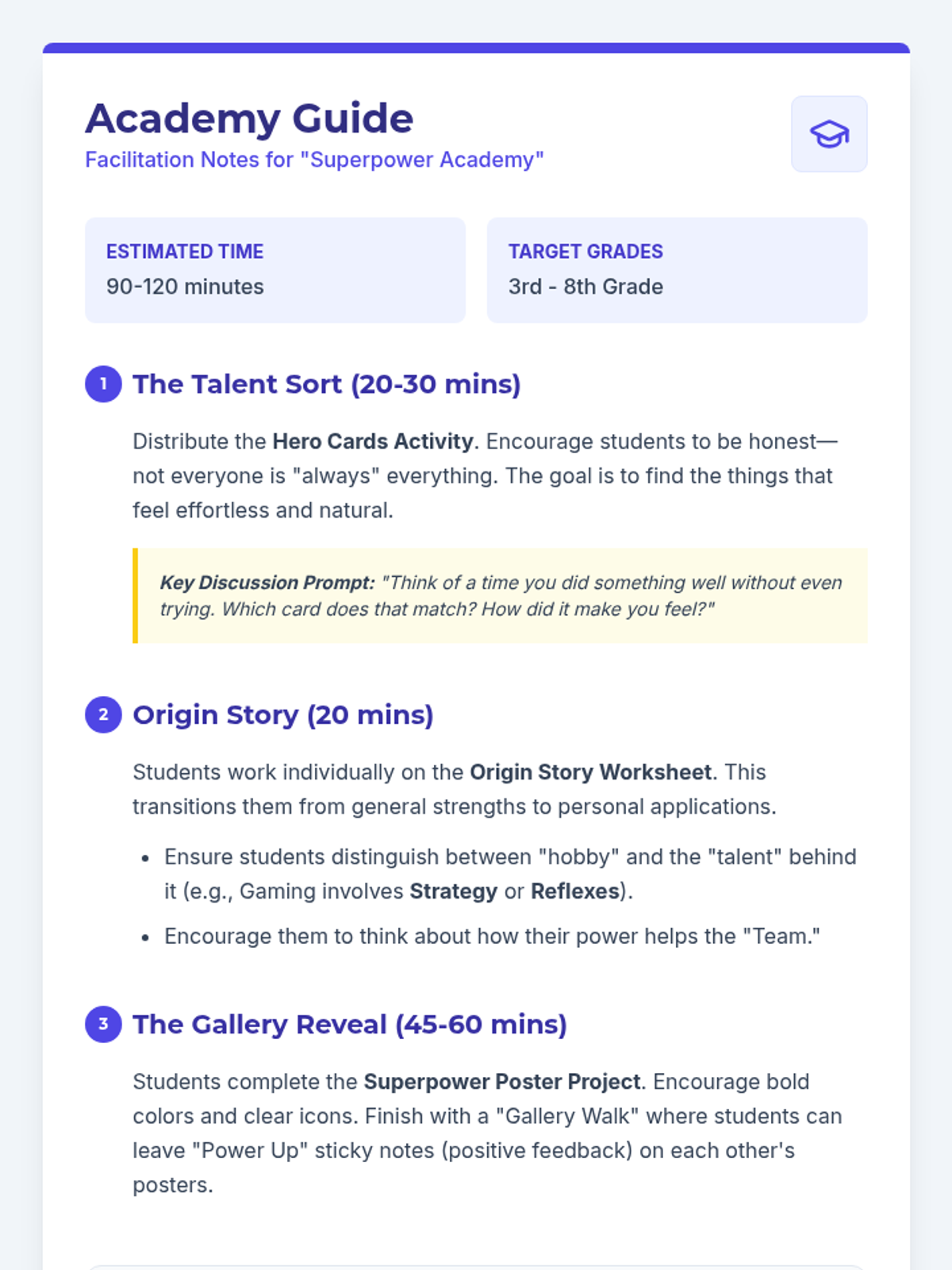 Facilitation notes for the Superpower Academy lesson. Includes pacing, discussion prompts, and differentiation strategies. Polished with proper page breaks and a concluding section.