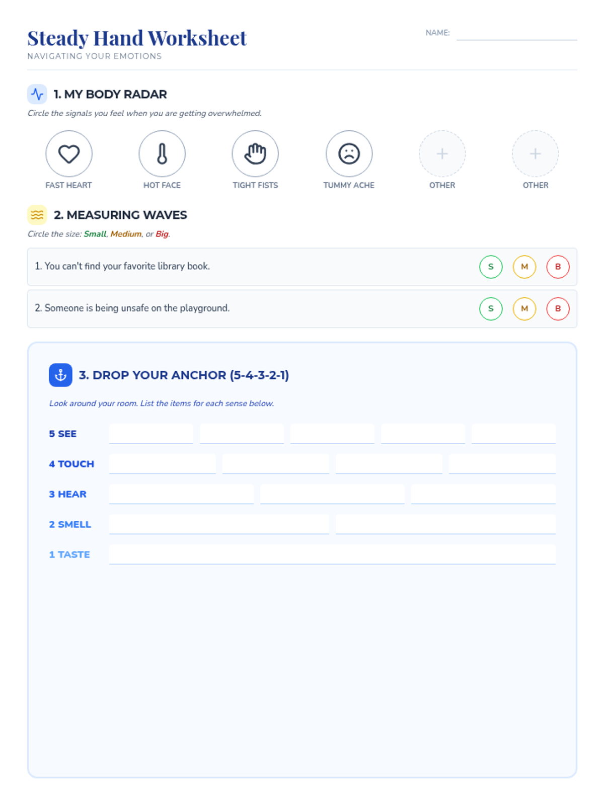 A student worksheet for emotional regulation practice. Features activities for identifying personal body signals, categorizing problem sizes, and a 5-4-3-2-1 grounding exercise with clear spaces for all required responses.