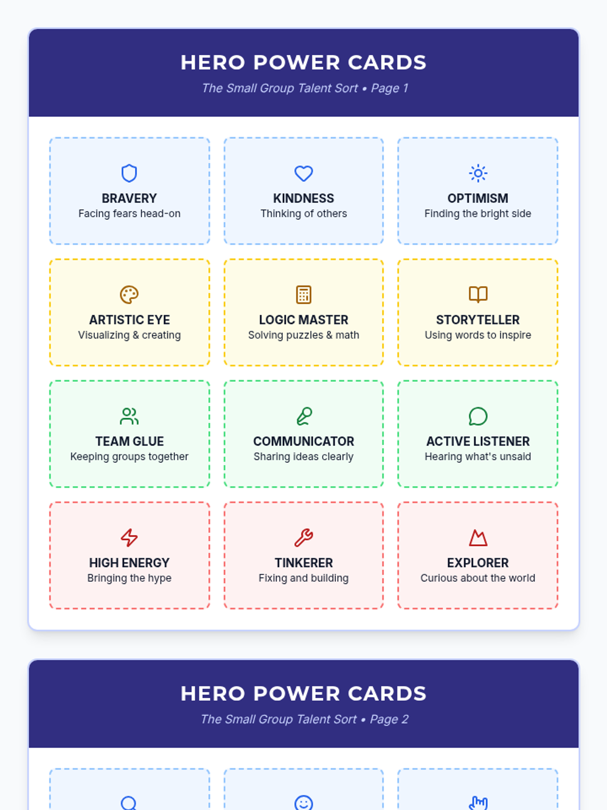 A set of 24 colorful, themed strength cards for a small group sorting activity, covering character traits, academic talents, social skills, and personal hobbies. Includes blank templates for customization.