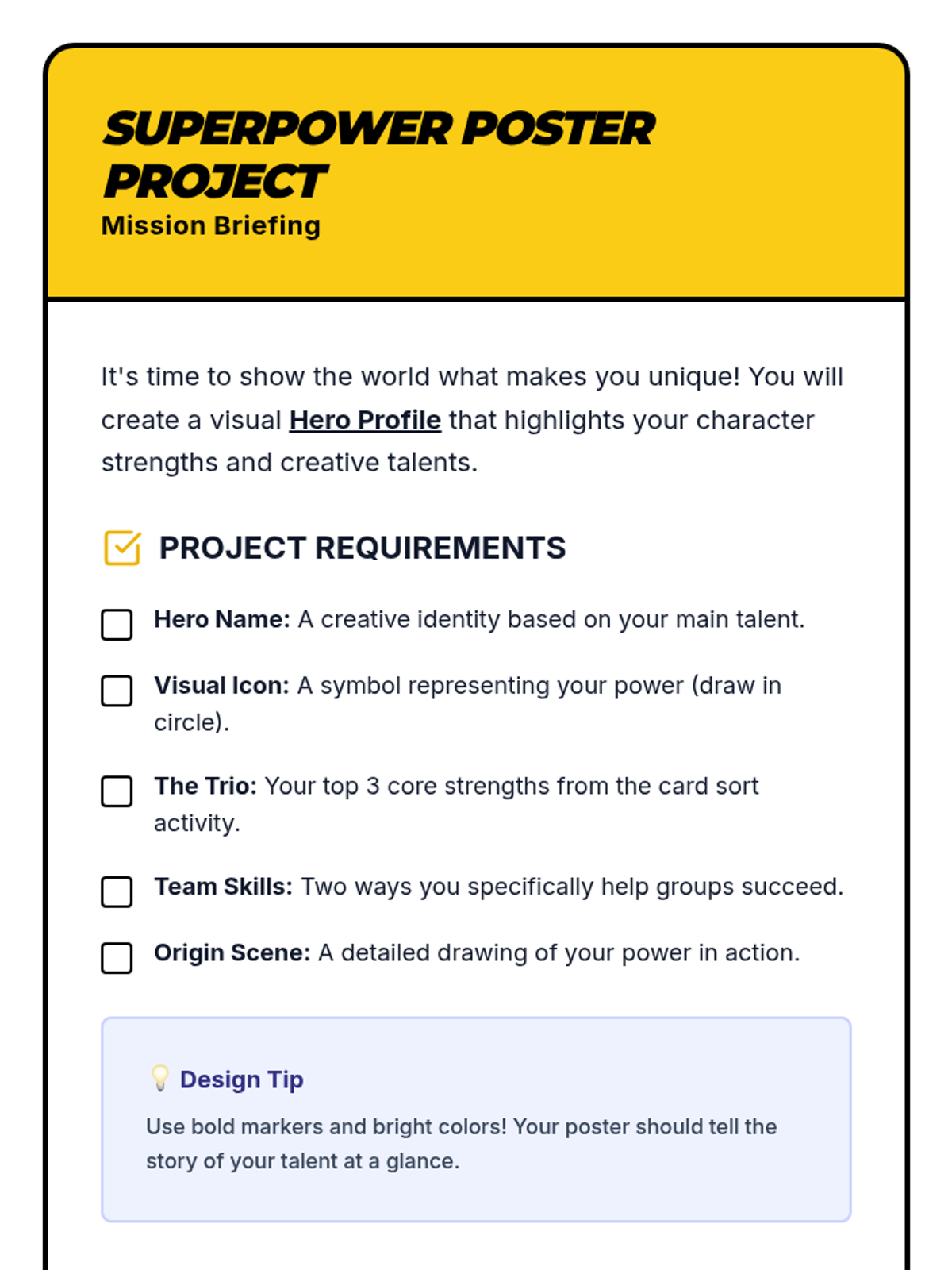 A project guide and layout template for a "Hero Profile" poster, encouraging students to visualize their strengths through icons and illustrations. Features a single-page printable template.