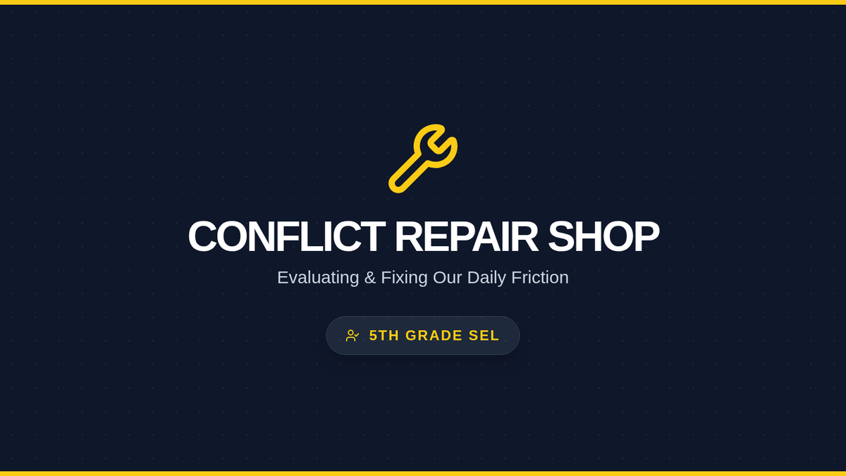 A 6-slide visual presentation for a 10-minute SEL lesson on conflict resolution. Uses a 'Repair Shop' theme with the 'Size of the Problem' scale, role-play instructions, and emotional check-ins, all designed with large text (24px+) and high-contrast visuals.