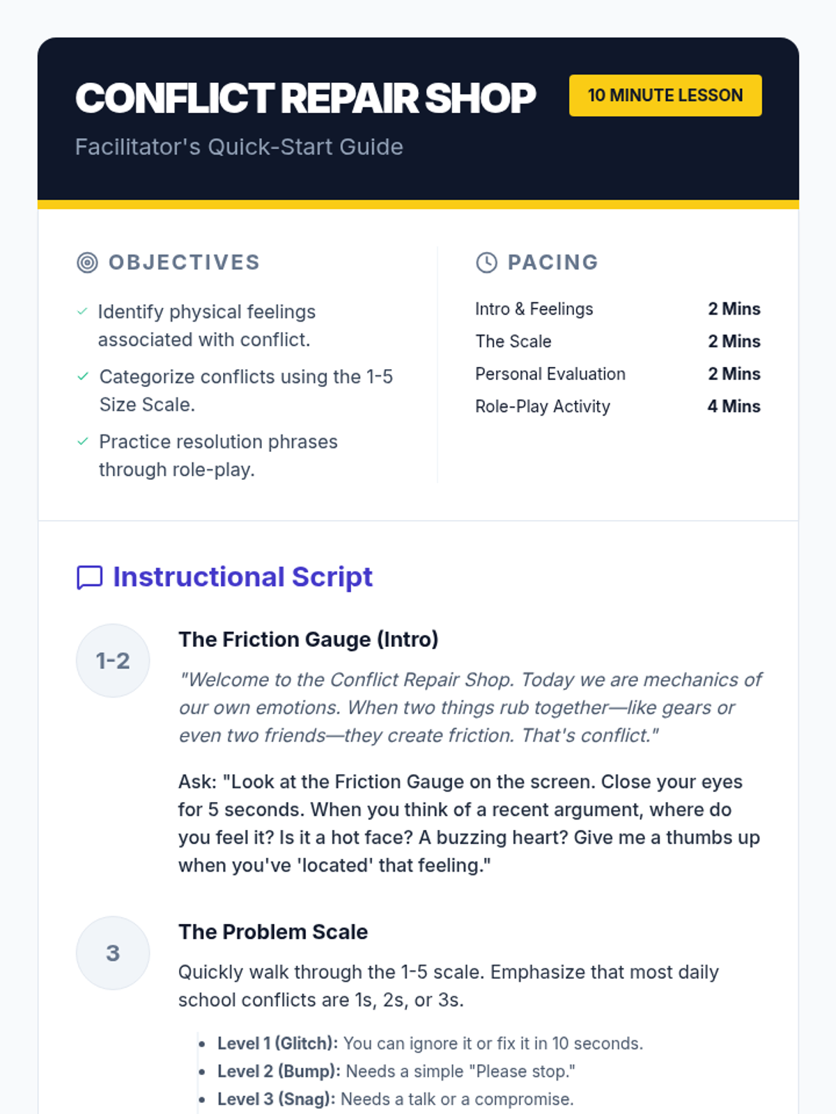 A detailed facilitator guide for the 'Conflict Repair Shop' lesson. Includes a 10-minute pacing guide, instructional scripts for each slide, specific role-play prompts, and tips for facilitating a writing-free SEL experience.