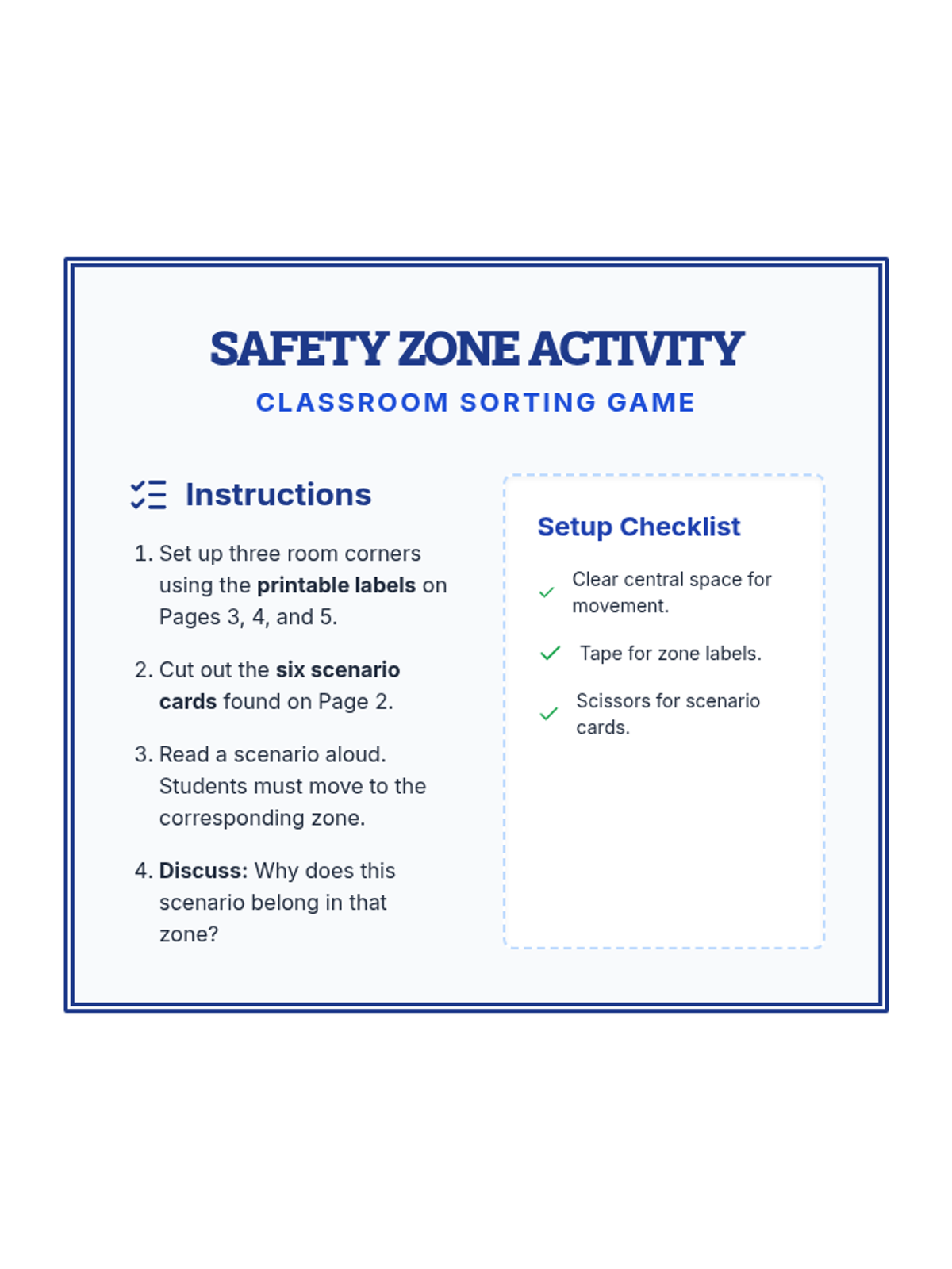 A kinesthetic classroom activity for Boundary Blueprints. Revised to fix card page breaks, remove category-telegraphing icons, and add printable zone labels for room setup. Added explicit page height and break styles for reliability.