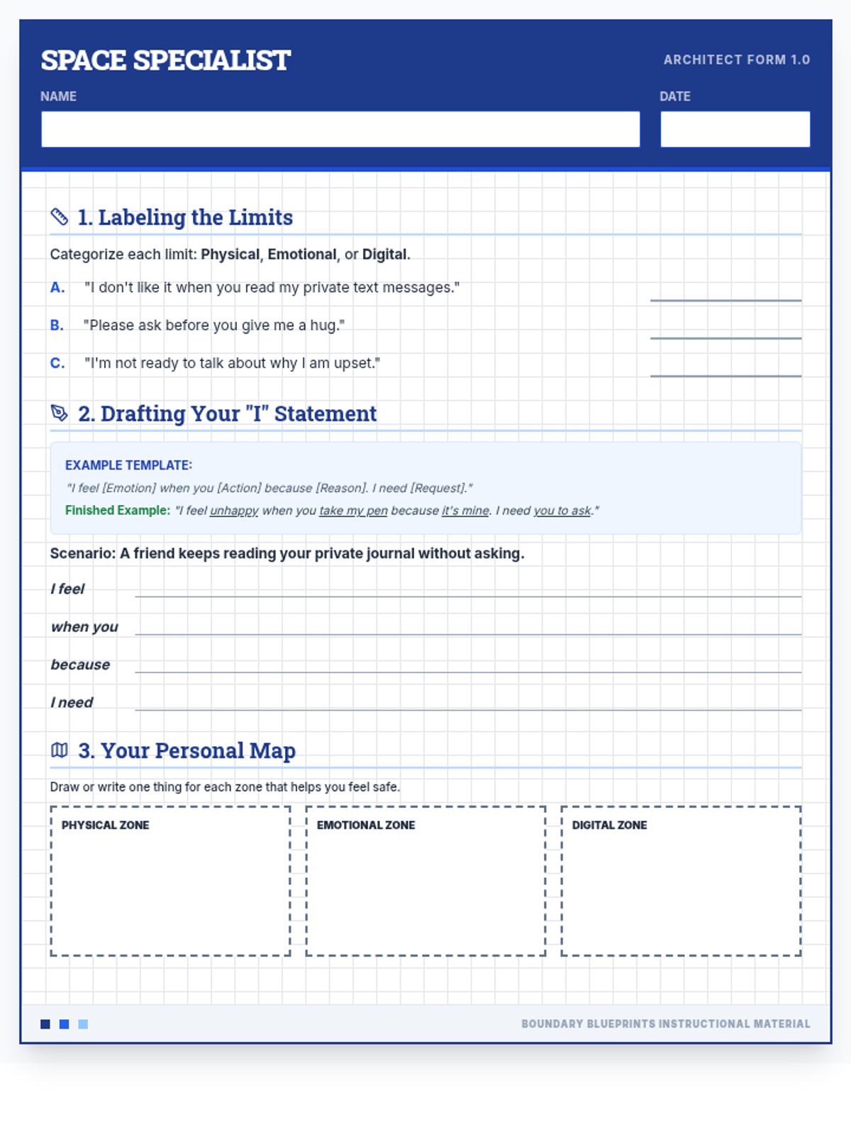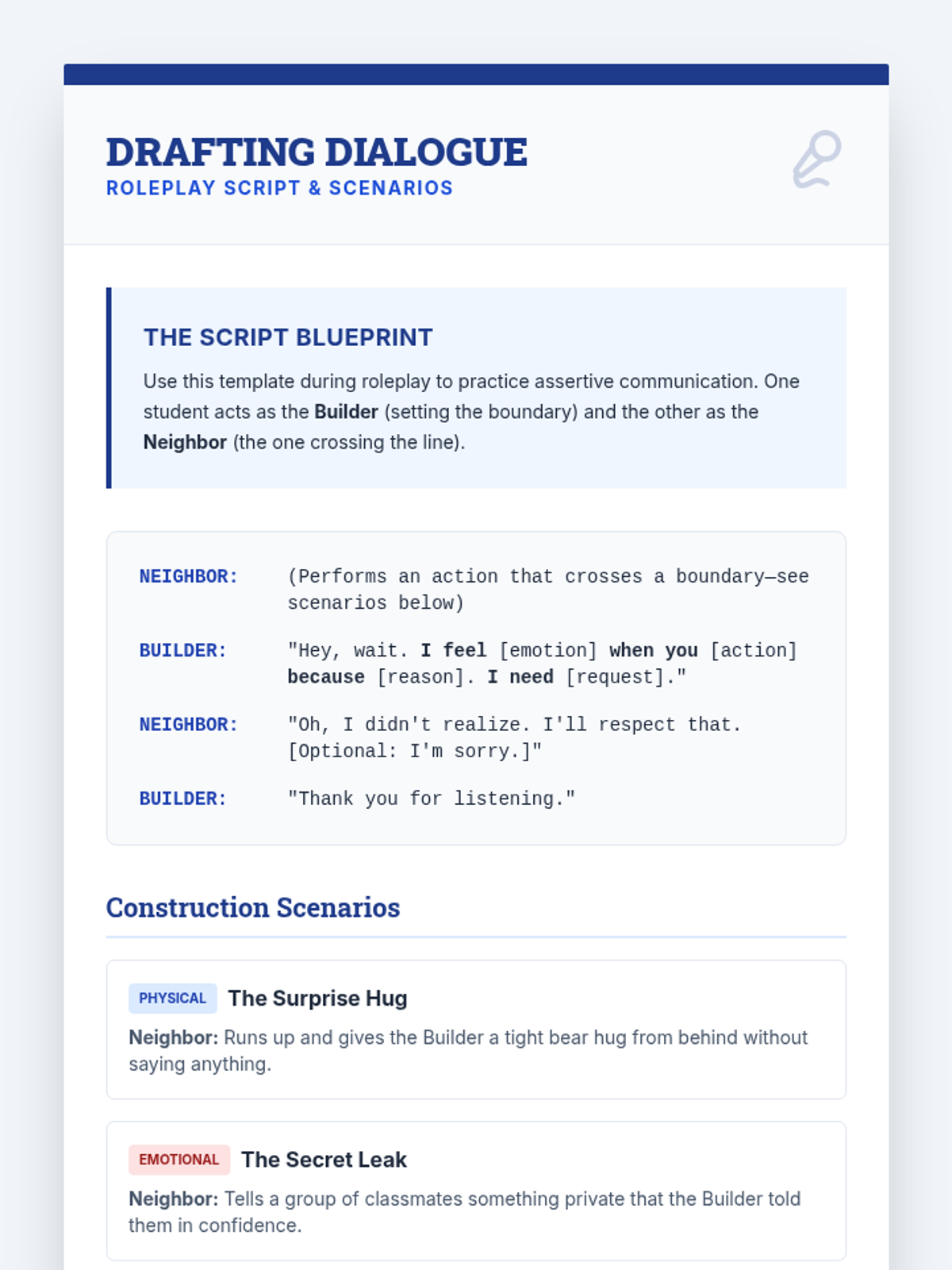 A teacher-facing roleplay script and scenario guide for Boundary Blueprints. Includes an "I" statement template and various physical, emotional, and digital scenarios for student practice.