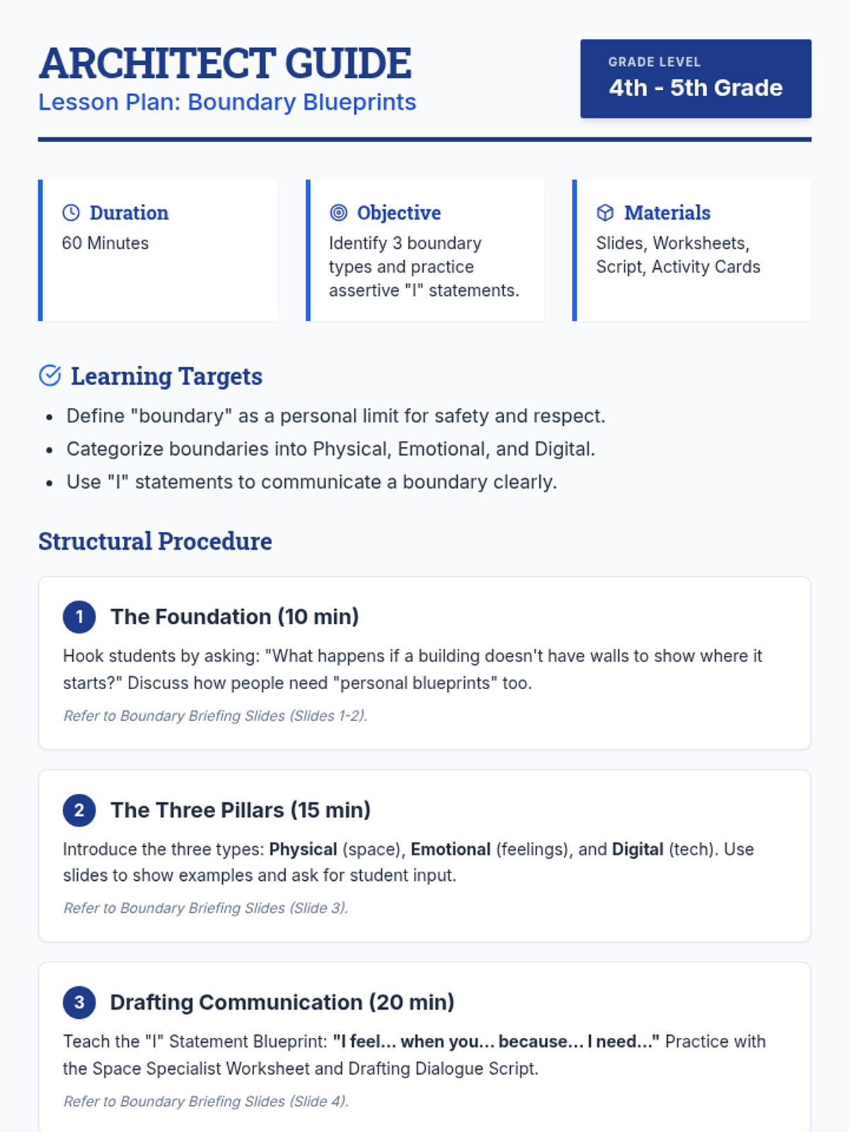 A detailed teacher-facing lesson plan for Boundary Blueprints, featuring structural procedures, learning targets, and differentiation strategies with an architectural theme. Revised for better page breaks and header spacing.