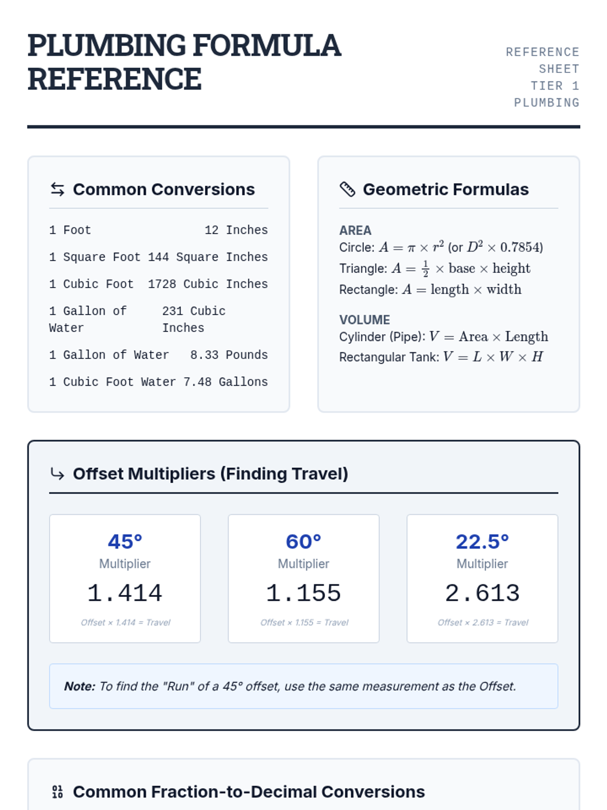 A essential reference sheet for plumbing apprentices featuring geometric formulas, offset multipliers, unit conversions, and fraction-to-decimal charts.