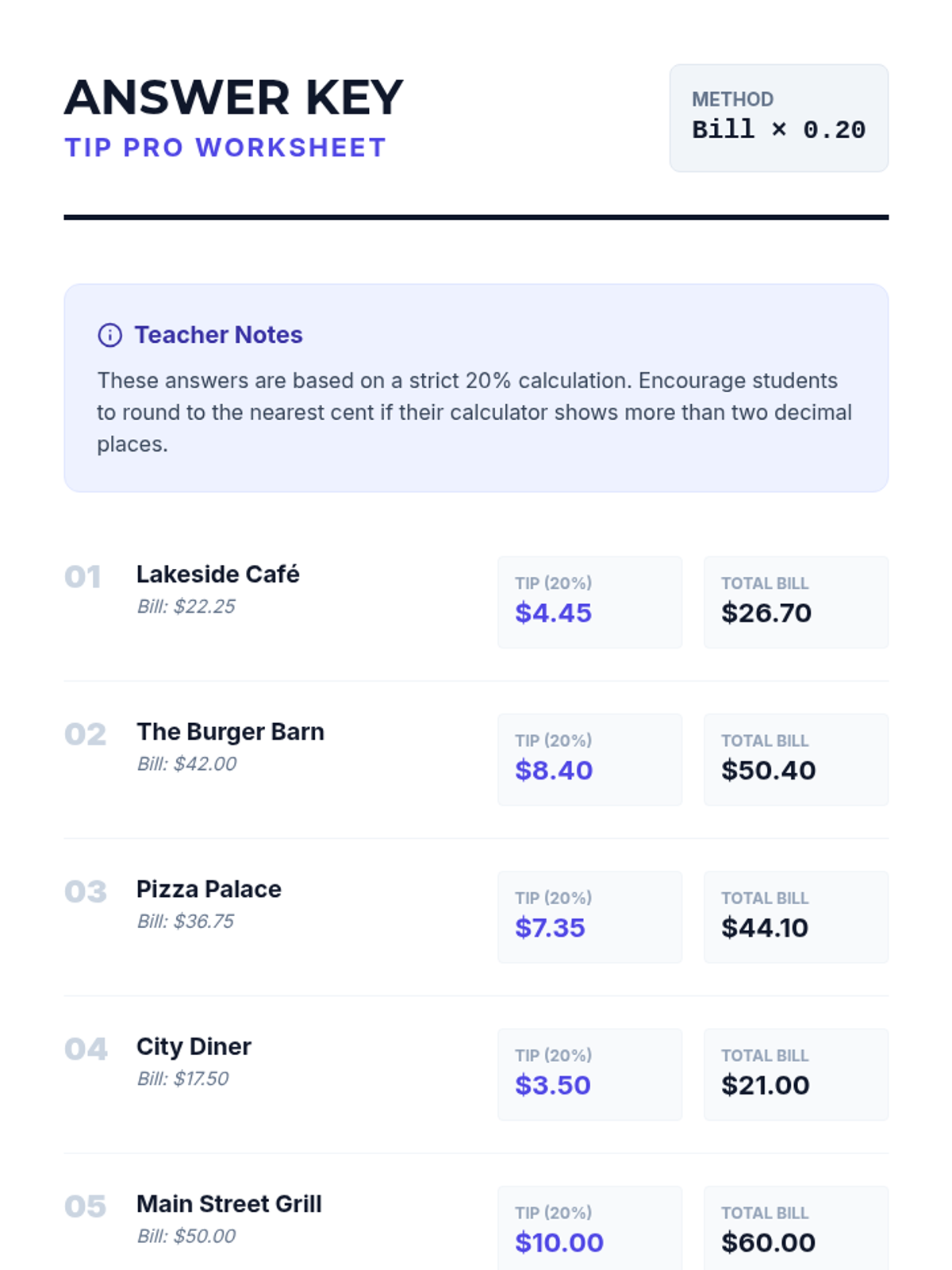 A clear answer key for the Tip Pro Worksheet, providing the 20% tip amount and total bill for all 6 restaurant scenarios.