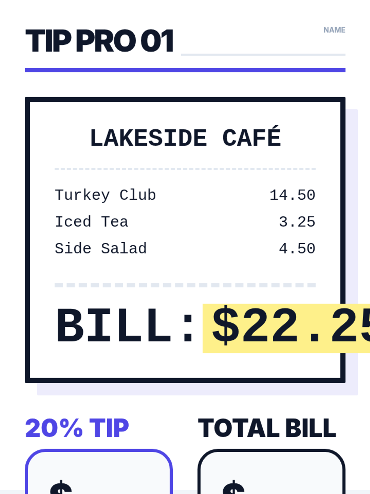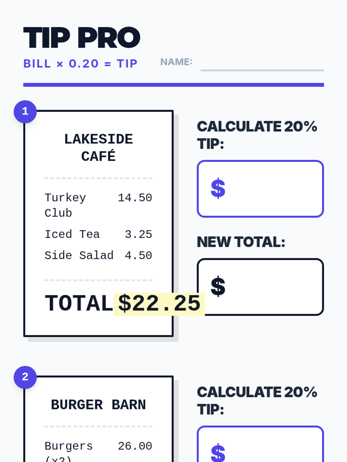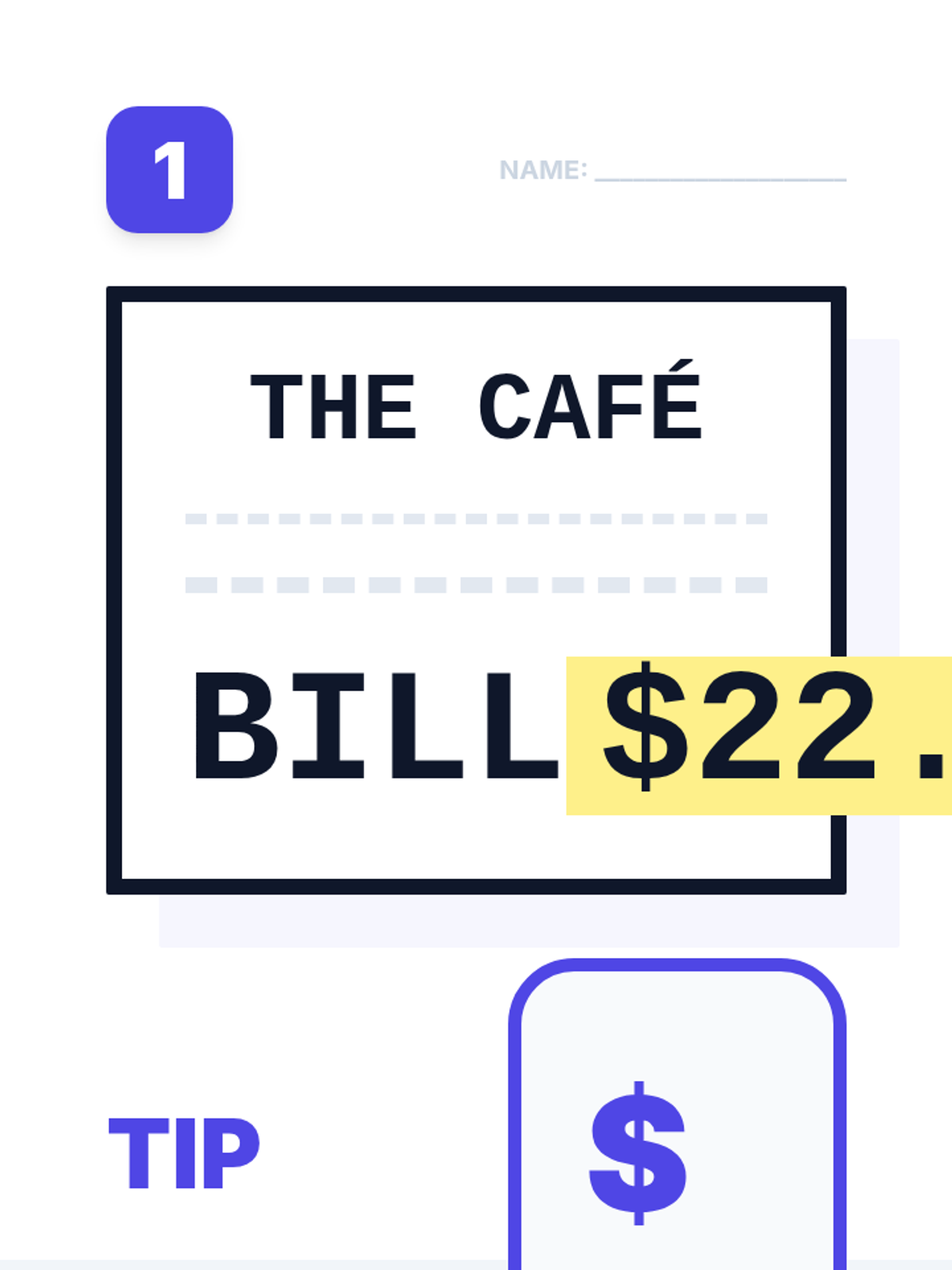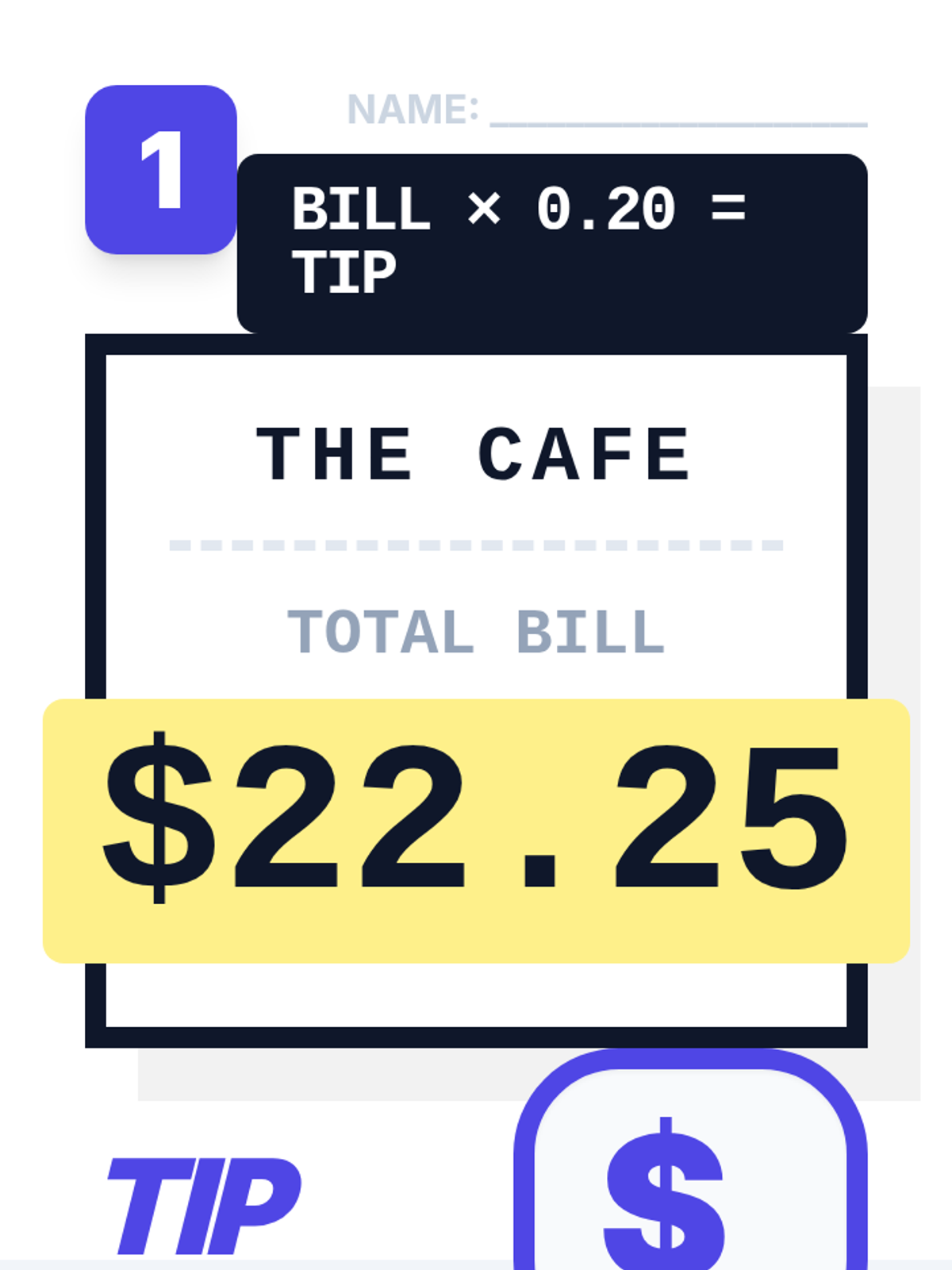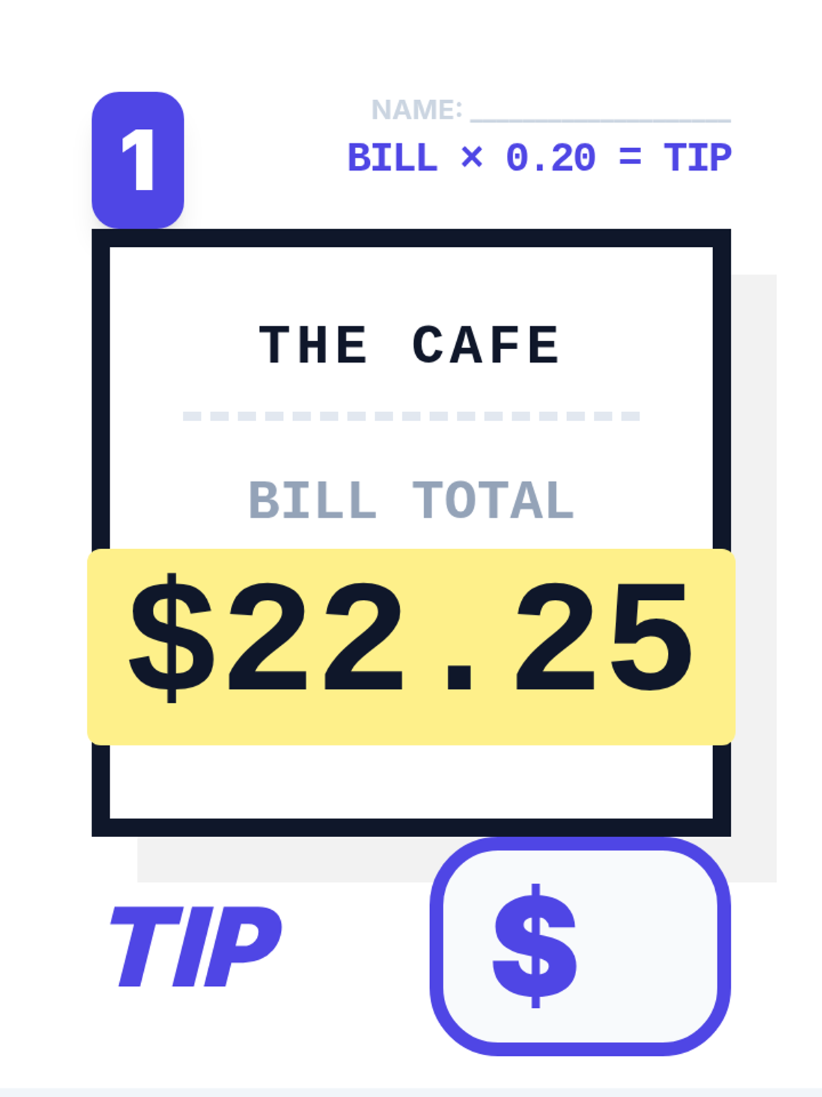 A ultra-simplified, high-visibility math worksheet for adult students focusing on calculating 20% tips. One massive scenario per page with minimal words and extra-large input areas.