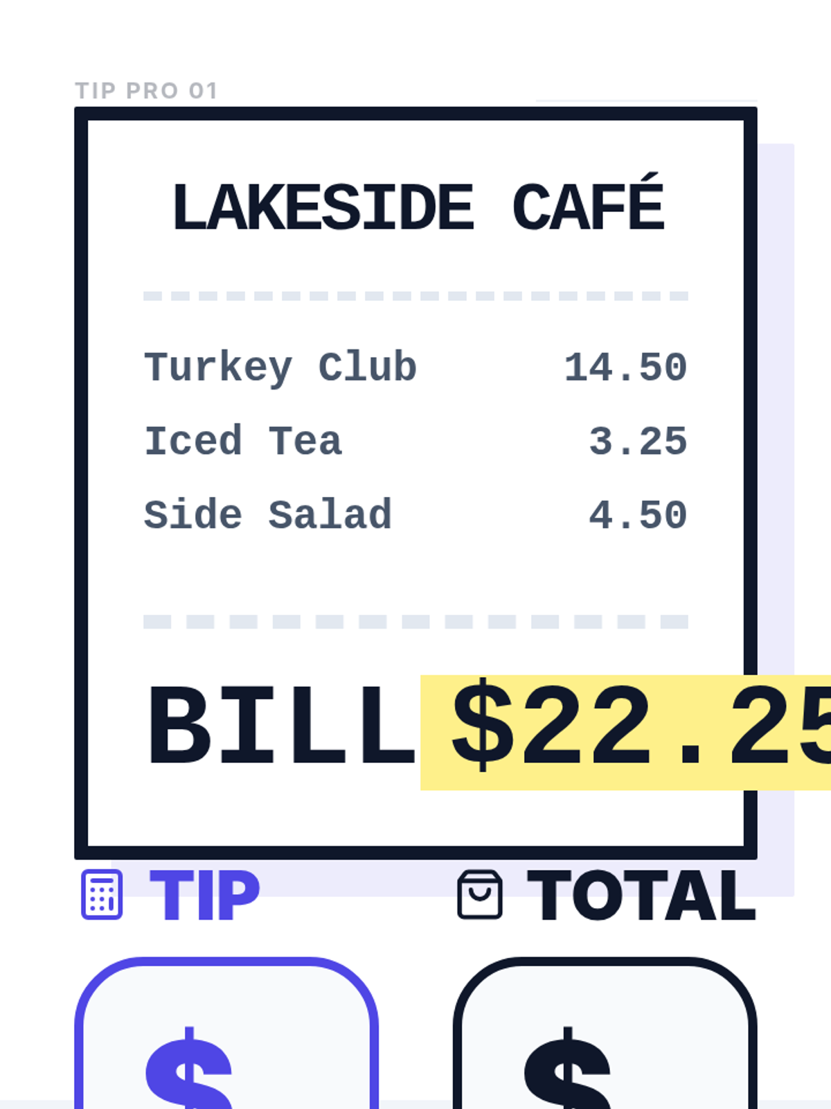 An ultra-simplified, high-visibility math worksheet for adult students focusing on calculating 20% tips. One massive scenario per page with absolute minimal text and giant font sizes.