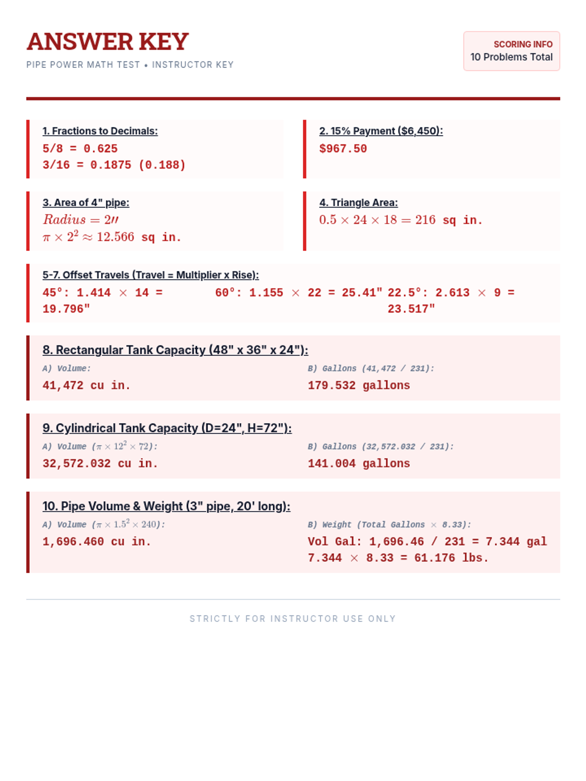 A detailed answer key for the Pipe Power Math Test, providing step-by-step solutions and scoring points for instructors.