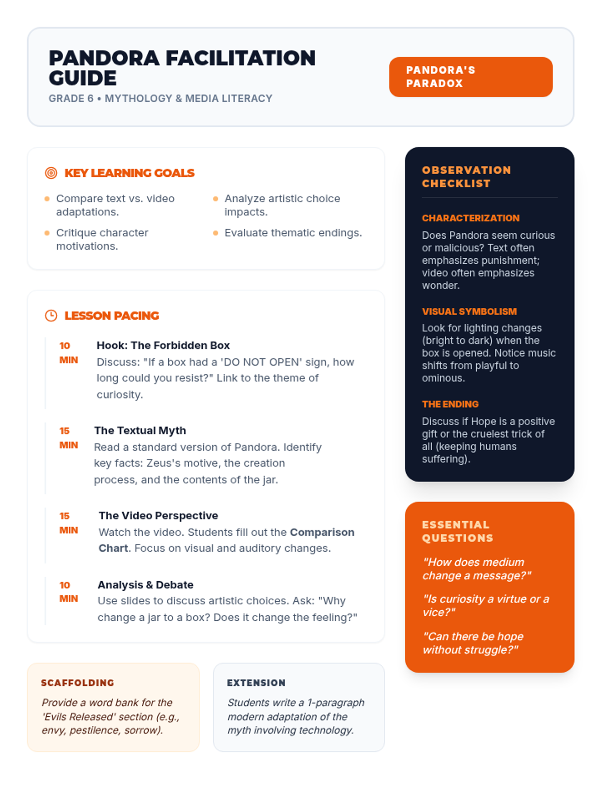 A teacher-facing guide for facilitating a lesson on the myth of Pandora. It includes learning objectives, a detailed pacing guide, differentiation strategies, and key points of comparison between video and text versions of the story.