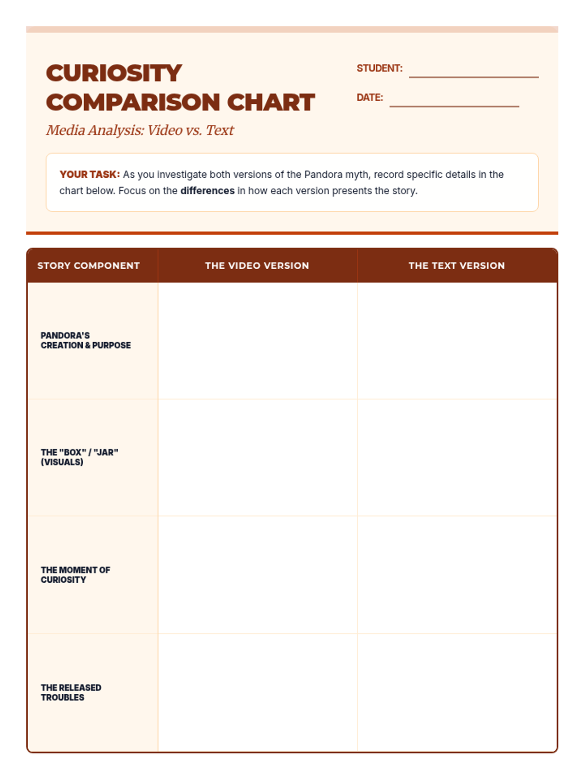 A compare and contrast chart for 6th-grade students to analyze the myth of Pandora across two different media formats: a video and a text passage. The worksheet features a structured table for direct comparison and open-ended synthesis questions to encourage deeper critical thinking.