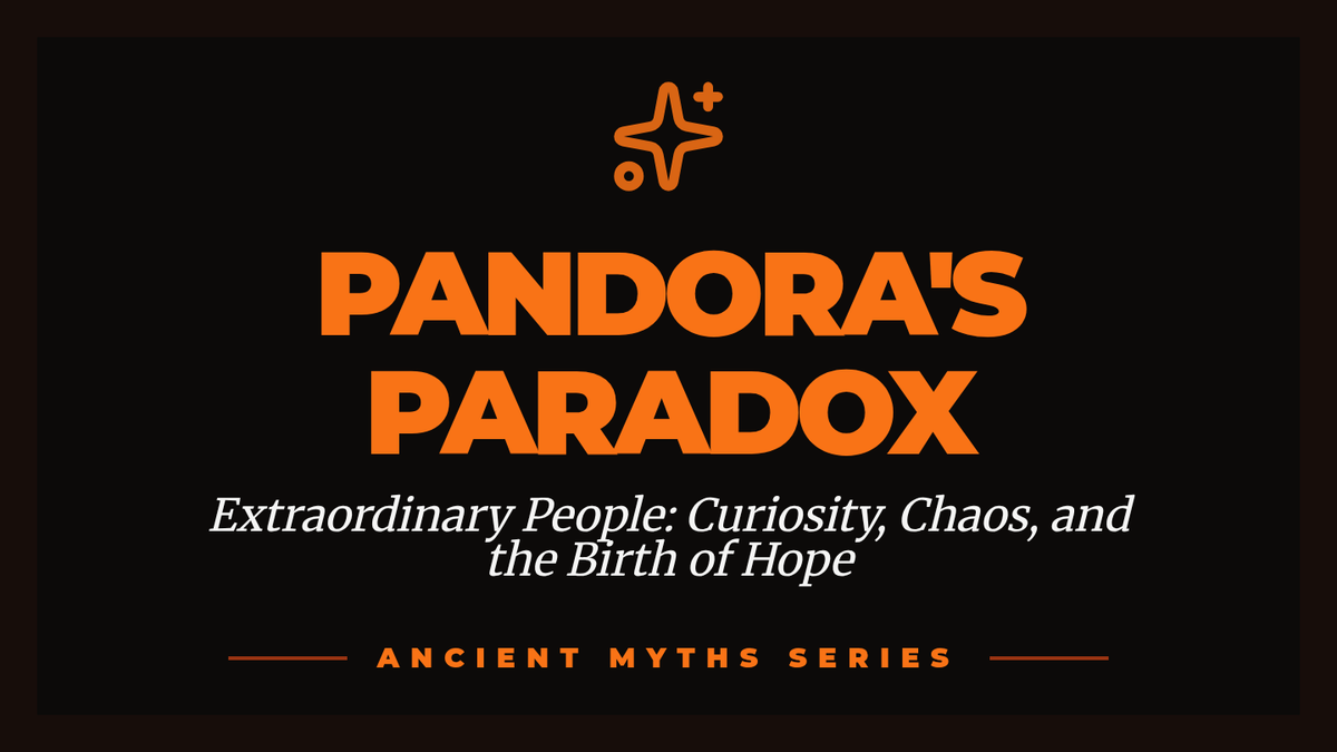 A visual slide deck designed to accompany a video-based lesson on the myth of Pandora. It includes mythic context, discussion prompts for comparing media formats, and thematic slides on curiosity and hope. Features a placeholder for a specific video URL.