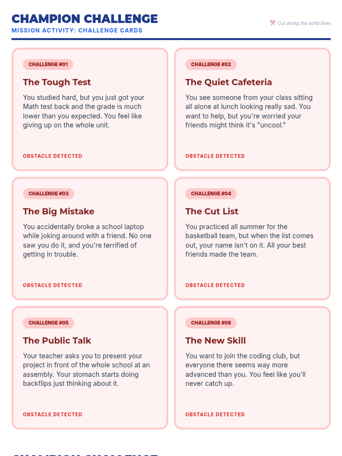 A two-page printable card game featuring 6 common 6th-grade challenges and 6 corresponding strength cards. Designed to help students practice applying strengths and growth mindset to real-world scenarios. Features improved layout for printing.