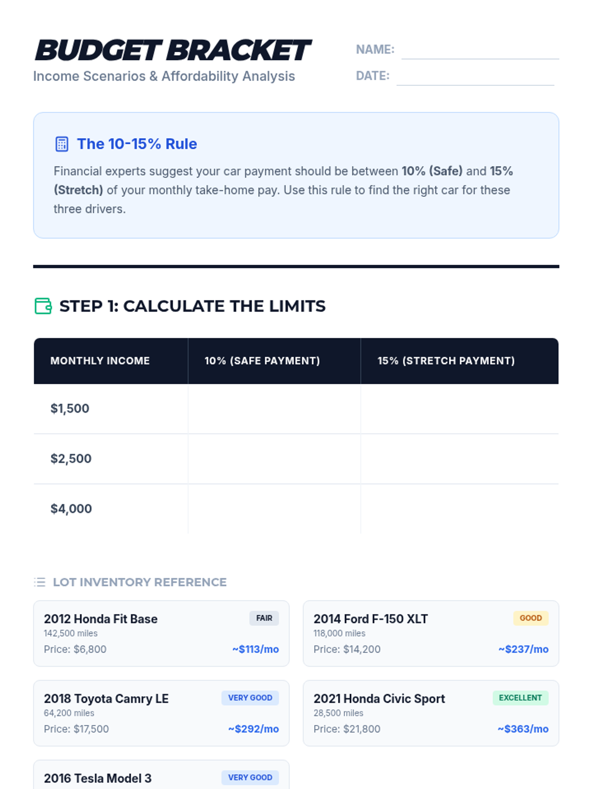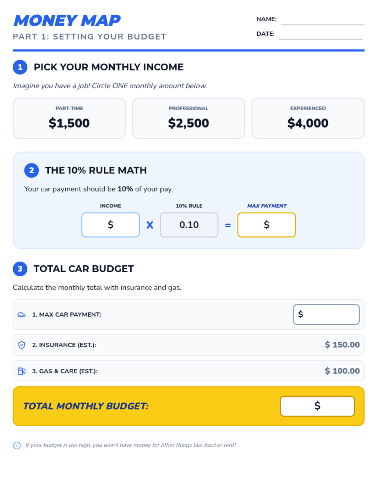 A student-facing worksheet for calculating a monthly car budget based on hypothetical income levels and the 10% rule. Updated to fit strictly on one page with high-contrast elements.