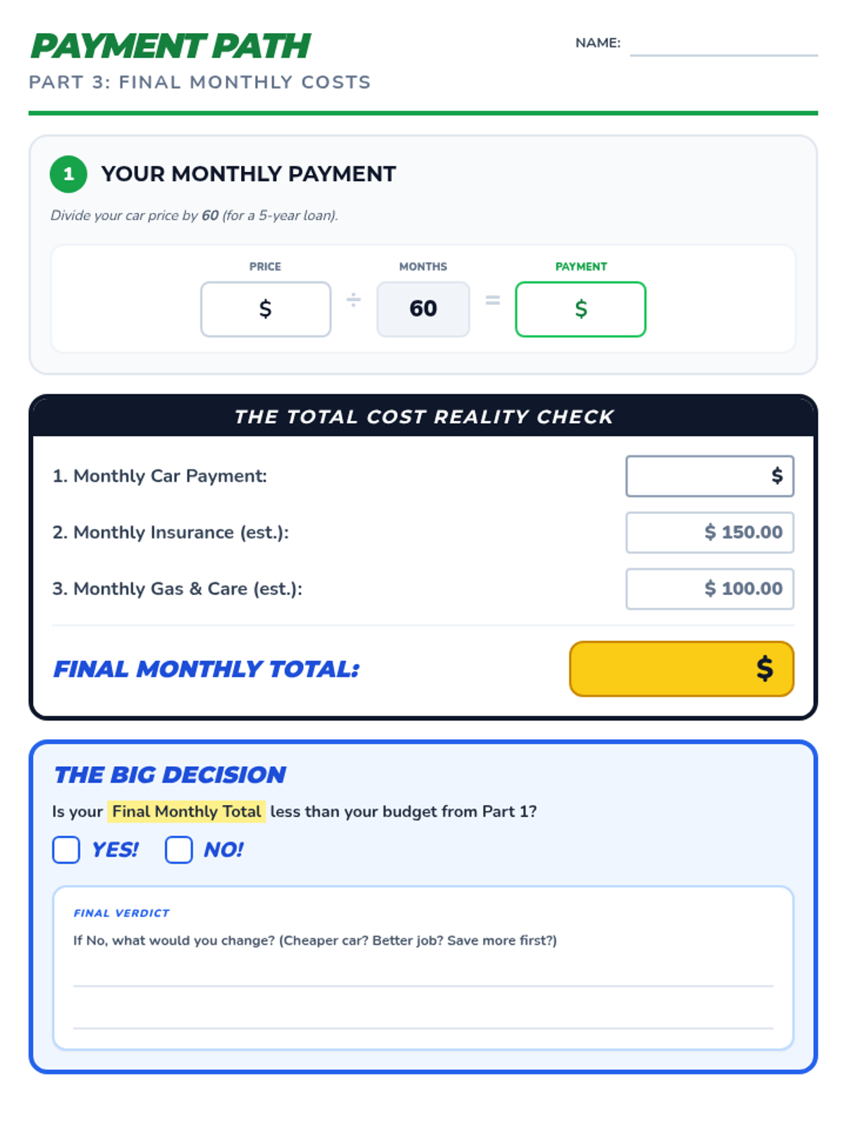 A worksheet for calculating the final monthly cost of car ownership. Updated for uniform table styling, improved contrast, and optimized single-page layout.