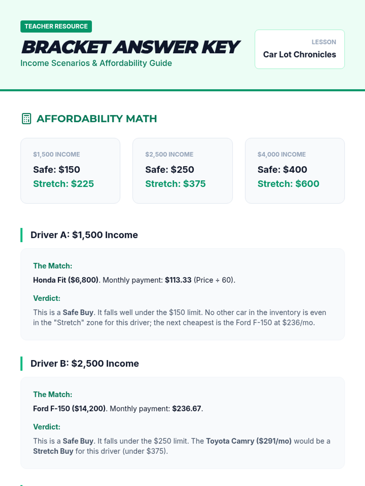 Teacher's answer key for the Budget Bracket worksheet, providing the math for each income level and matching each driver to the car inventory.