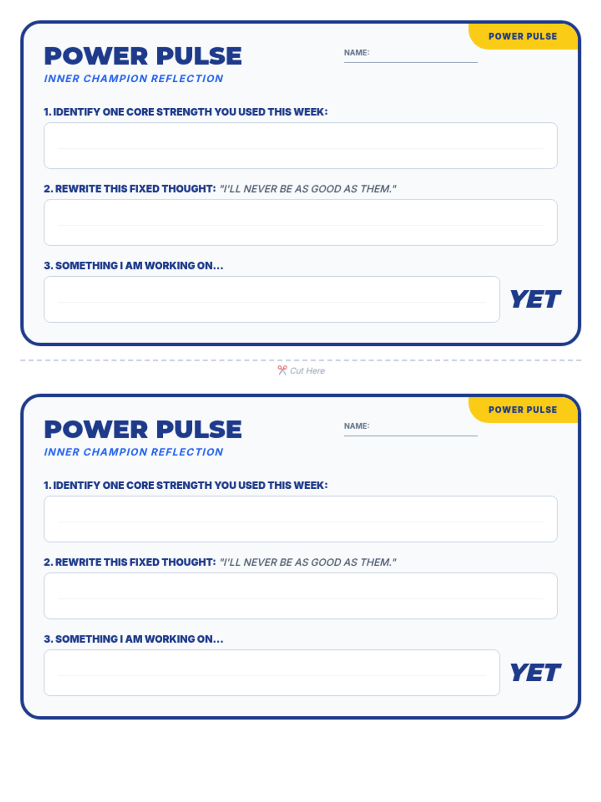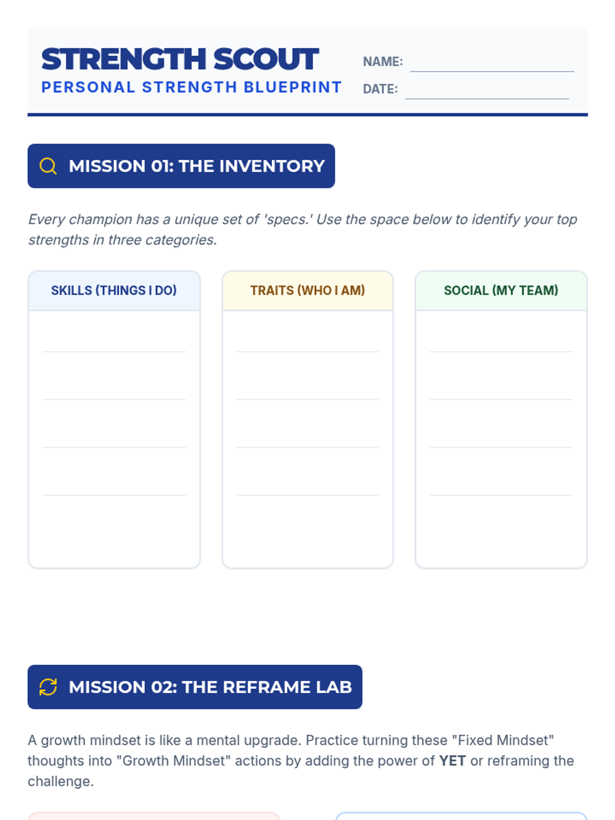 A 2-page student worksheet with a strengths inventory, mindset reframing activity, and resilience reflection. Features improved spacing, larger work areas, and clear page breaks.