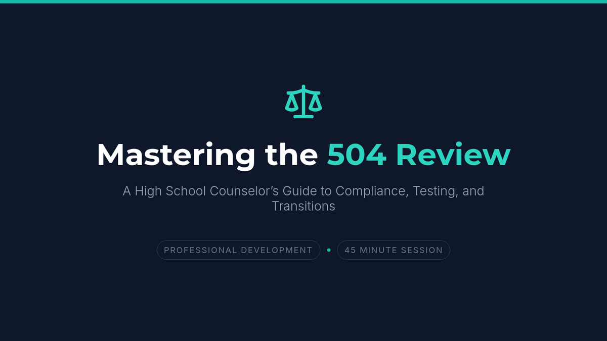 A 11-slide presentation for high school counselors on leading 504 review meetings, covering legal timelines, standardized testing, post-secondary transitions, and four interactive case studies.