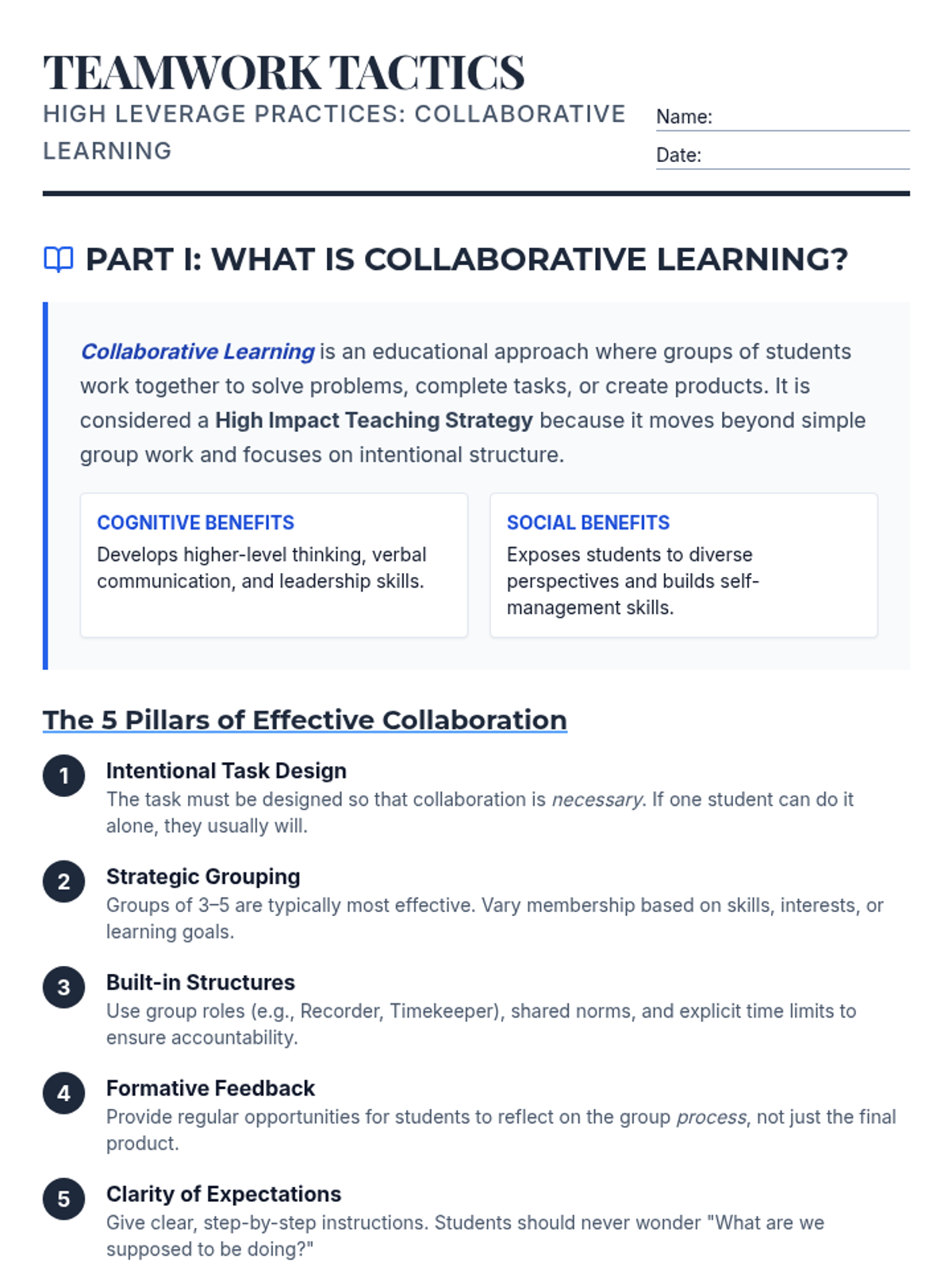 A multi-page student worksheet designed for future educators to learn the principles of collaborative learning and classroom protocols. It includes informational text, scenario analysis of a coin-toss activity, and a deep dive into structured academic discourse protocols like 'Save the Last Word.'