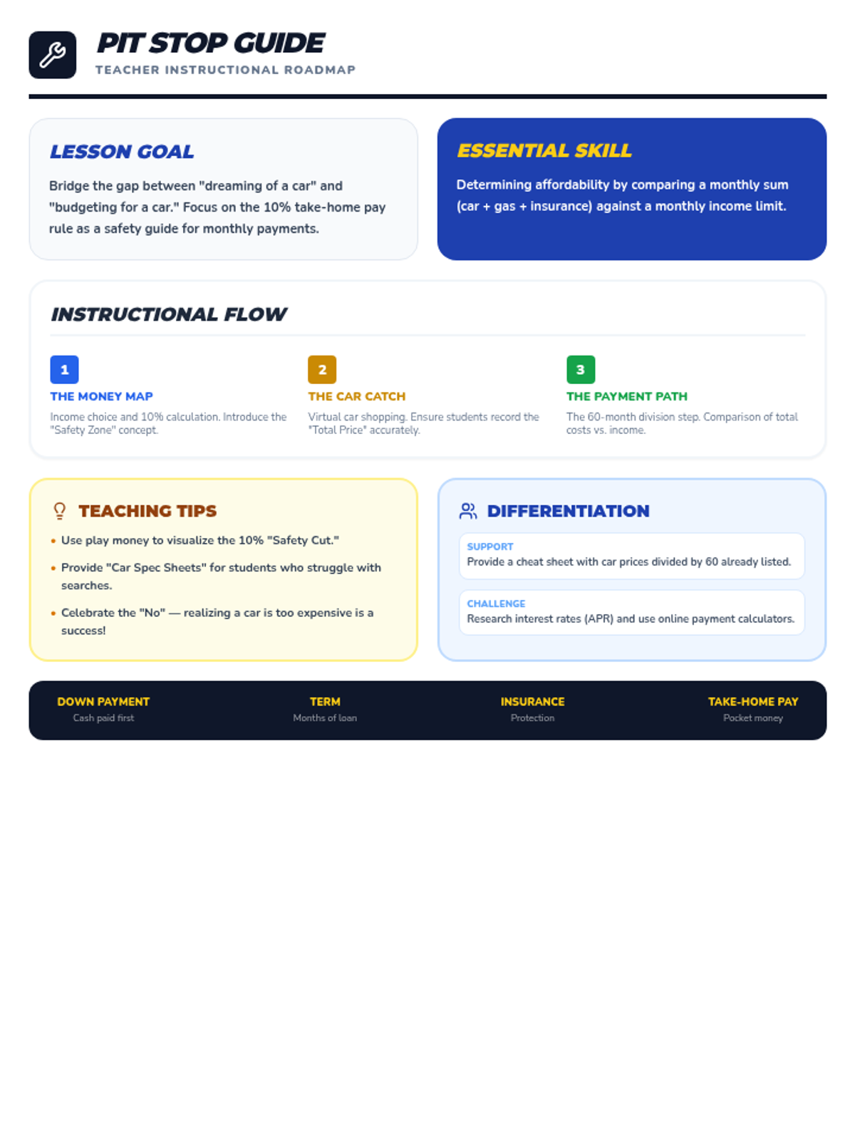 A teacher guide for the car-buying project. Consistently formatted to fit on a single page with clear instructional pathways and differentiation strategies. Revised for improved color contrast and font sizing.
