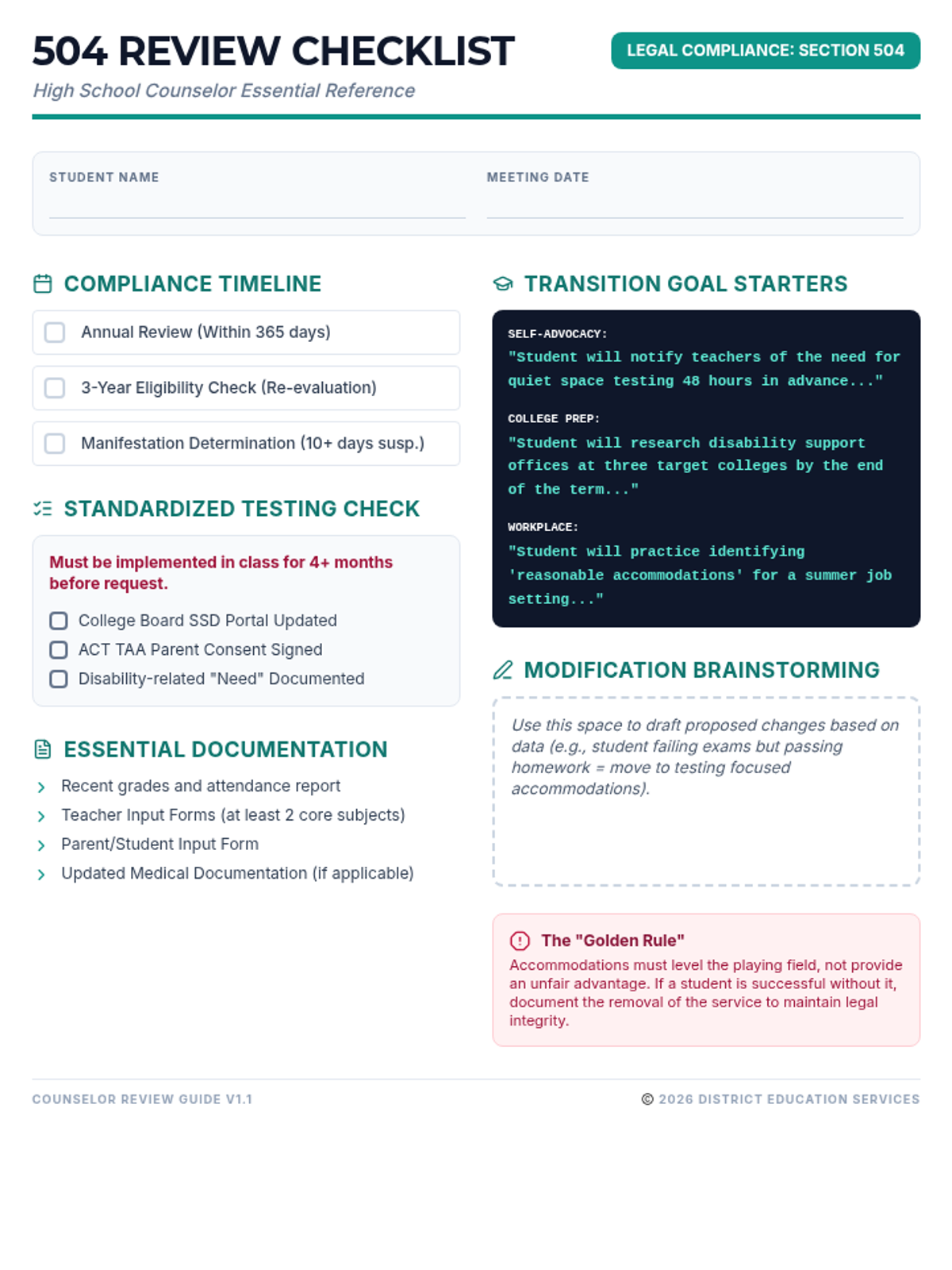 A practical one-page reference sheet for high school counselors, featuring a compliance timeline, standardized testing requirements, and post-secondary transition goal templates. Revised for improved contrast and legibility.